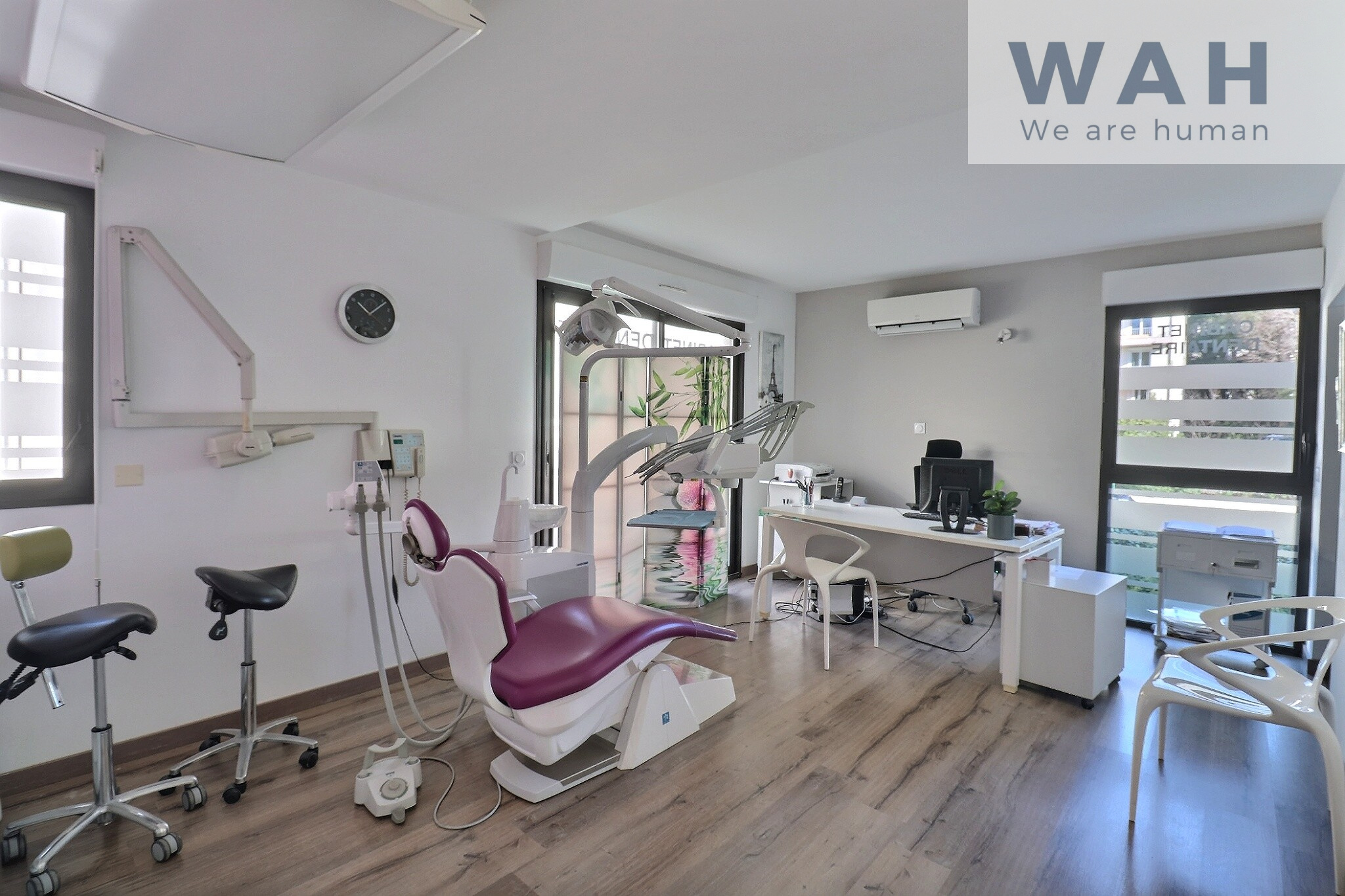 Le cabinet dentaire, de type T2 de 44,20 m2, est situé au 1er étage. Il est composé d'une salle d'attente, de wc, d'une pièce principale, ainsi que d'une cuisine. Il est également accompagné d'une terrasse de 5.5m2.