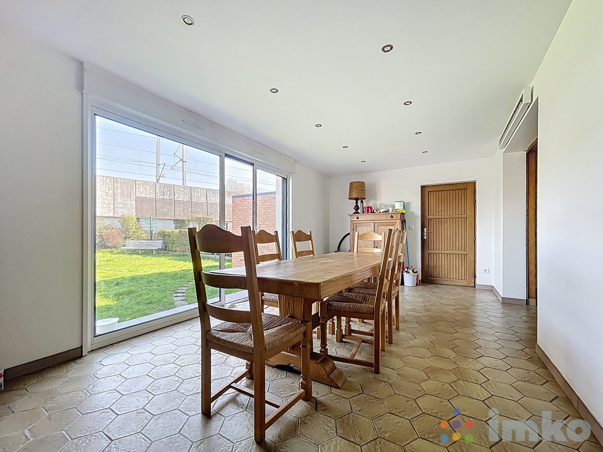 Le rez-de-chaussée se compose d'un salon/séjour, d'une salle à manger avec une grande baie vitrée donnant sur le jardin, d'une cuisine et d'une entrée avec rangements et WC séparés.