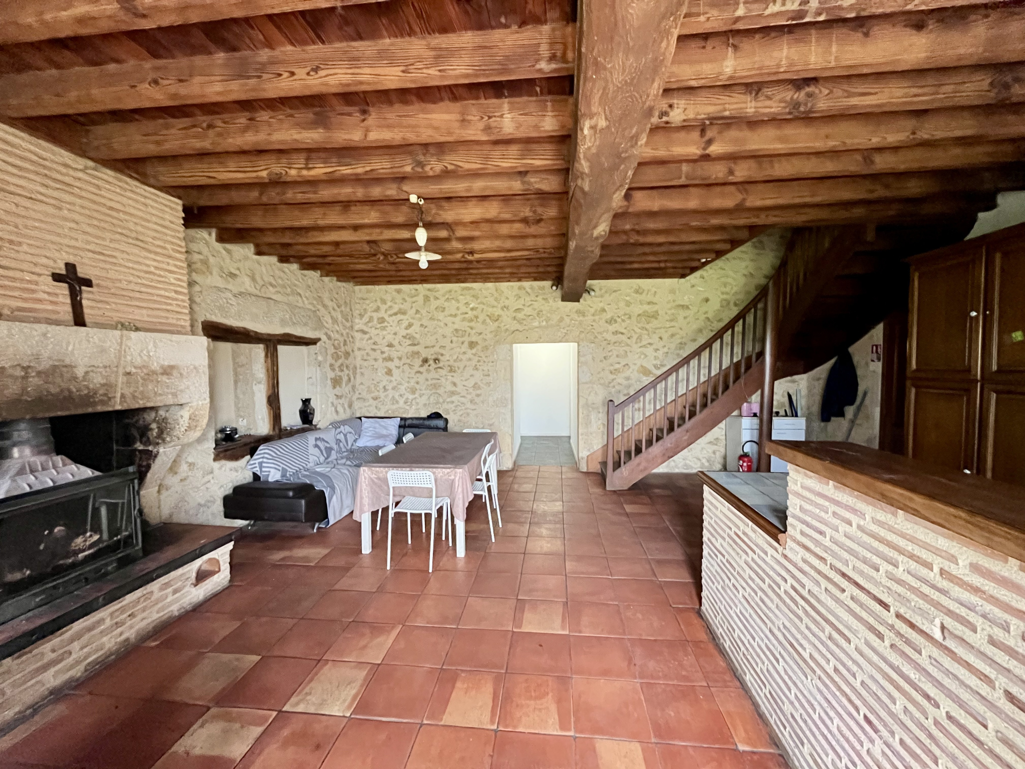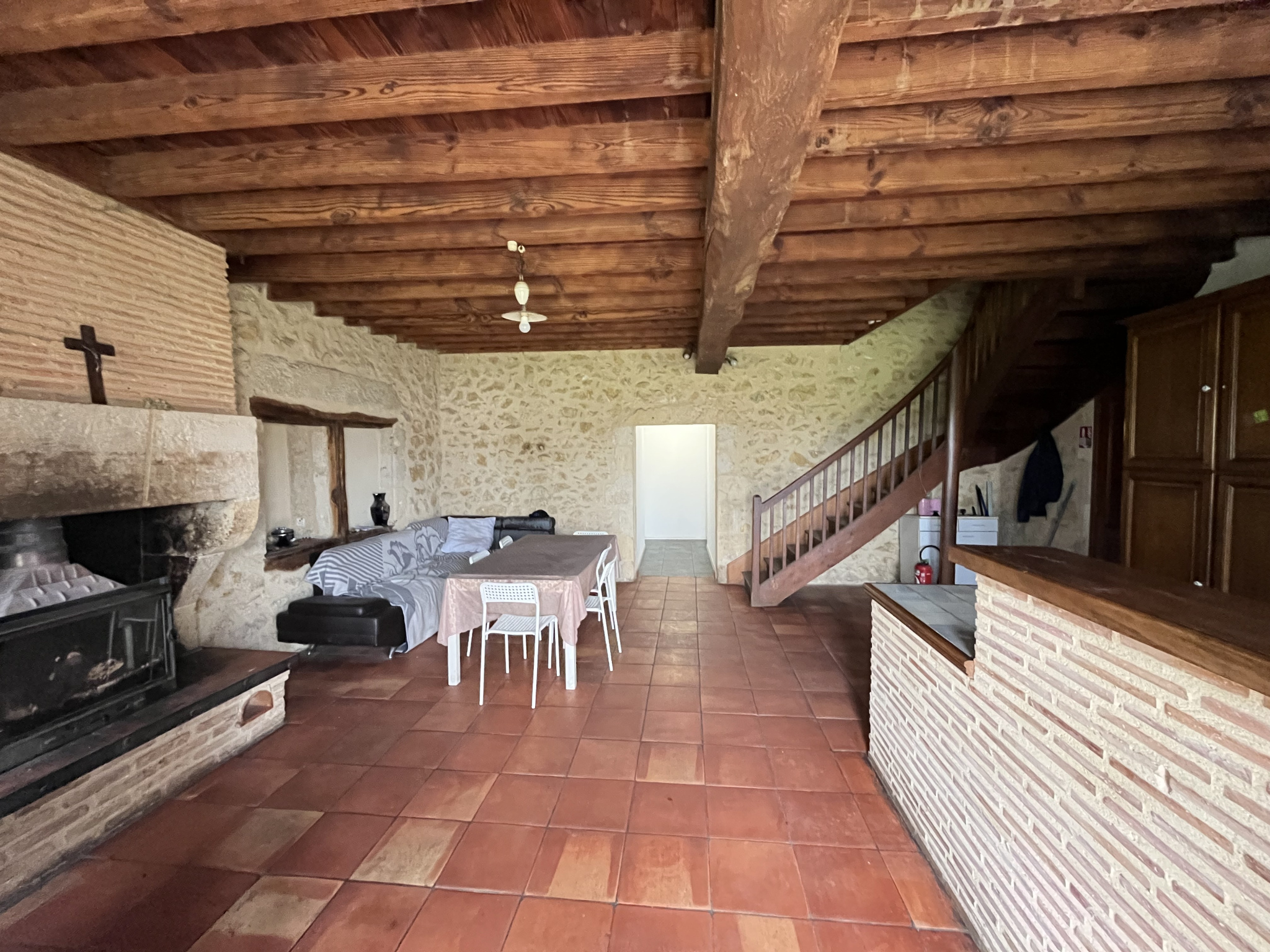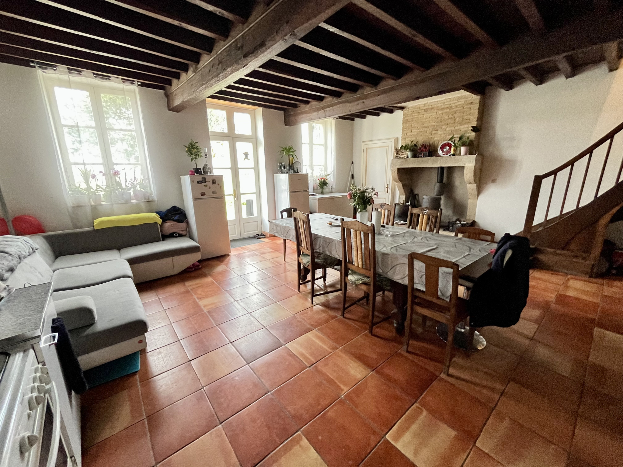 Prestations anciennes, sol en terre cuites, cheminée d'origine en pierre, poutres apparentes.