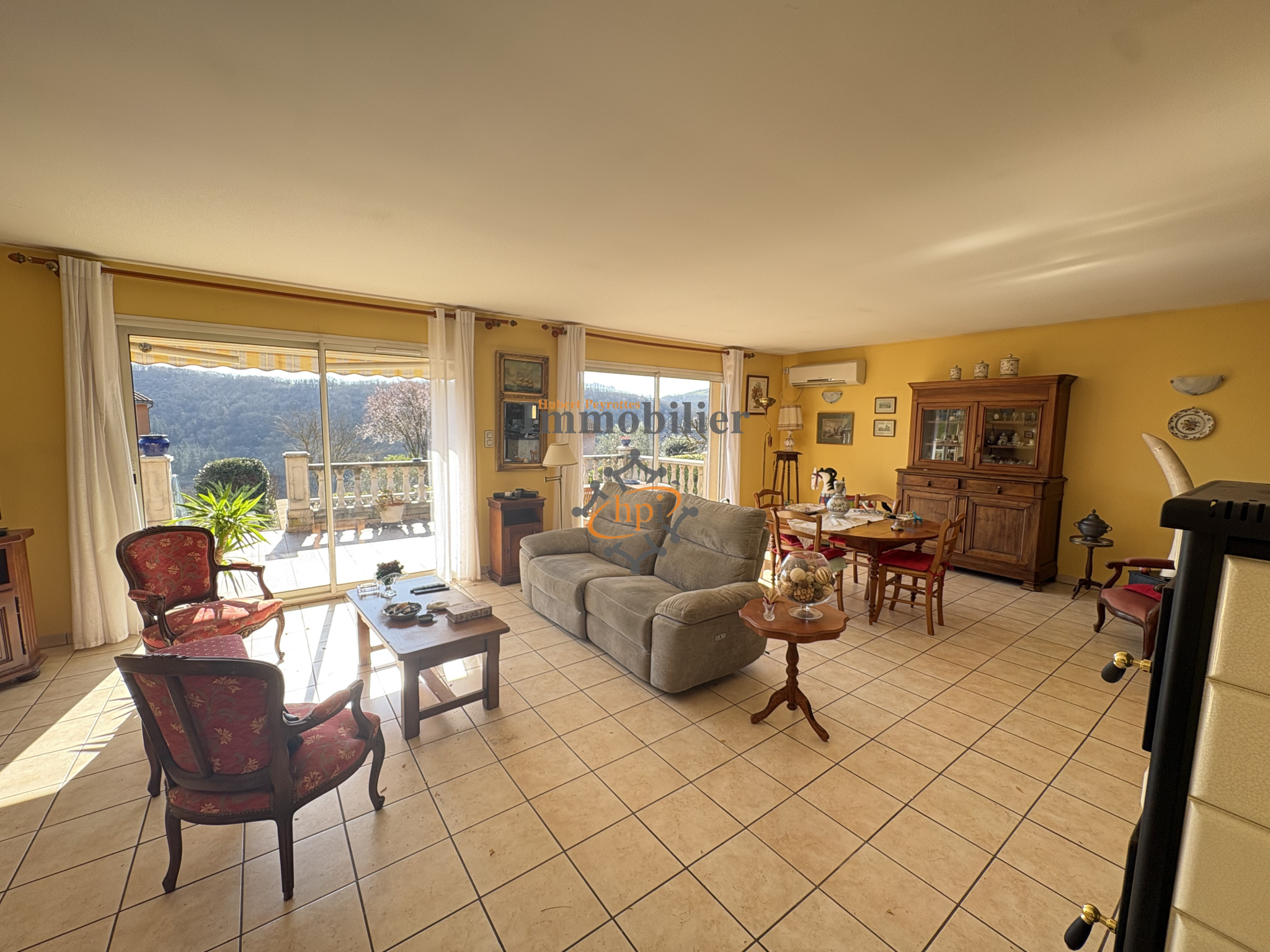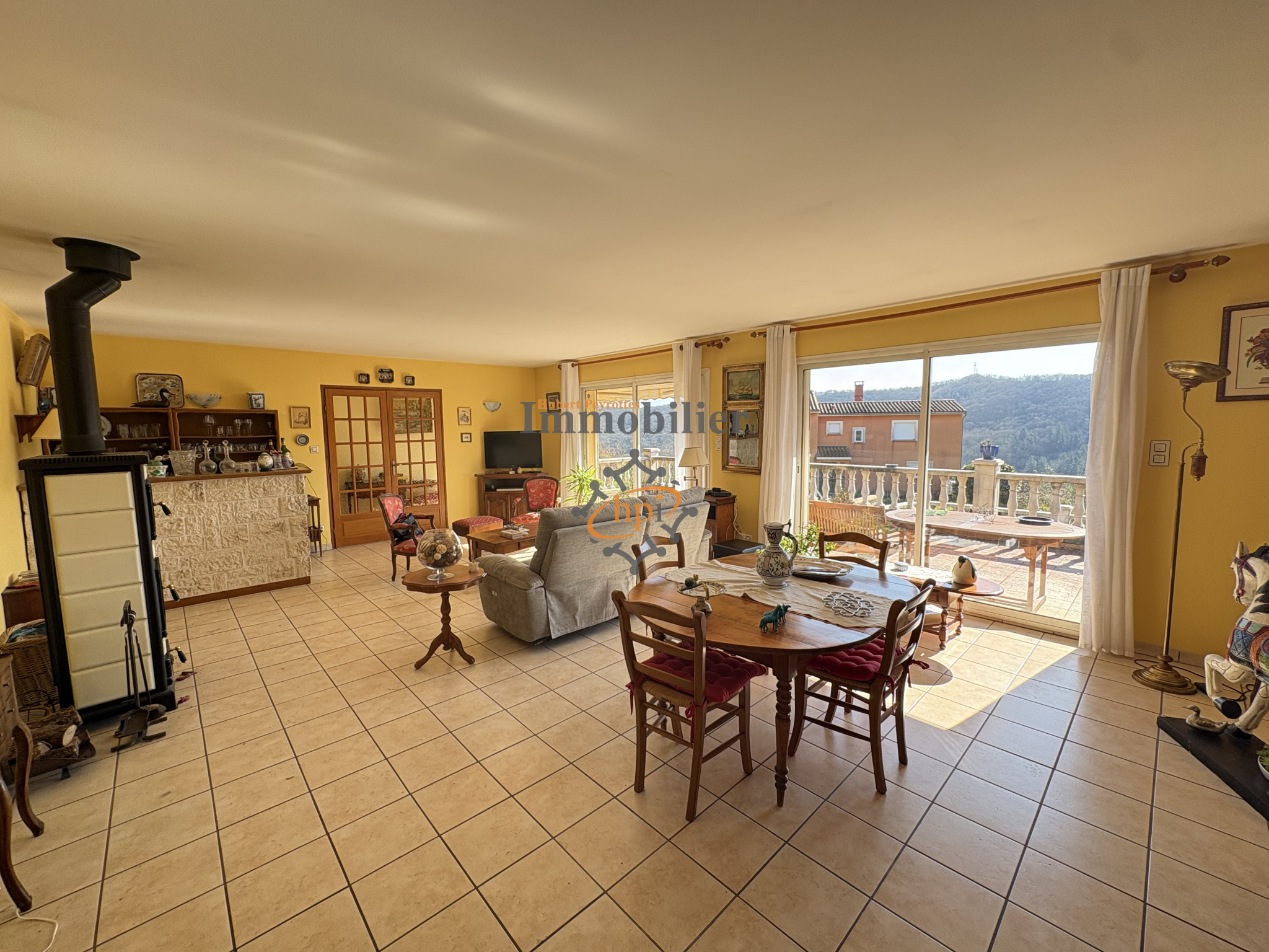 Broquiès, au calme, maison avec garage sur 897 m2 de terrain. Maison 126 m2 habitable, salon séjour avec cuisine ouverte intégrée et équipée 59 m2, donnant sur terrasse 35 m2, trois chambres avec placards et salle d'eau. Grand garage 78 m2, remise 18 m2 et Jardin attenant. Chauffage au sol, climatisation réversible, double vitrage. Exposition Sud et vue dégagée.