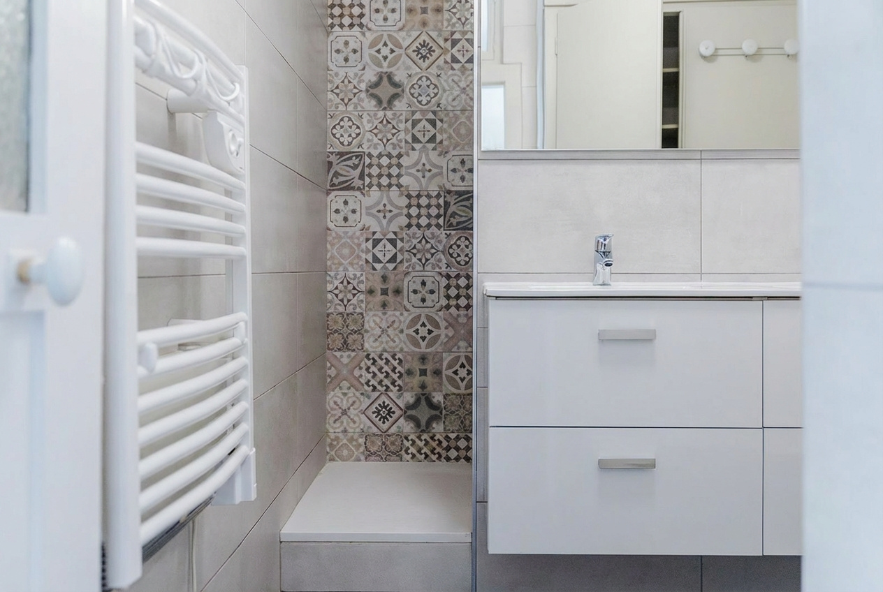 Montez au deuxième étage pour découvrir l'espace nuit : deux chambres distinctes, une salle d'eau entièrement rénovée avec douche, double vasque et rangements intégrés, ainsi qu'un WC indépendant. Un grenier sous charpente apparente au dernier niveau offre un espace de stockage appréciable.