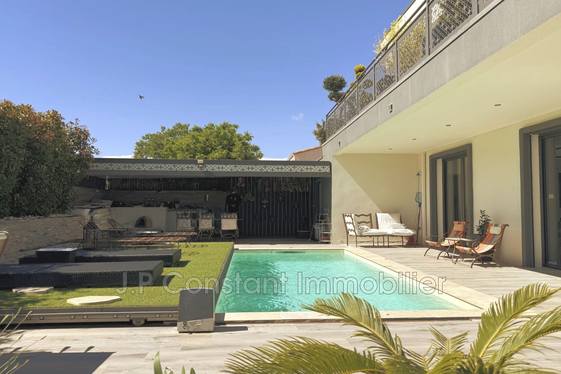 Extérieur très soigné, avec piscine couverte par une terrasse rétractable et une cuisine d'été.