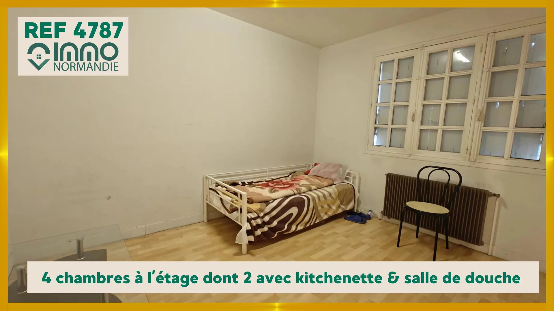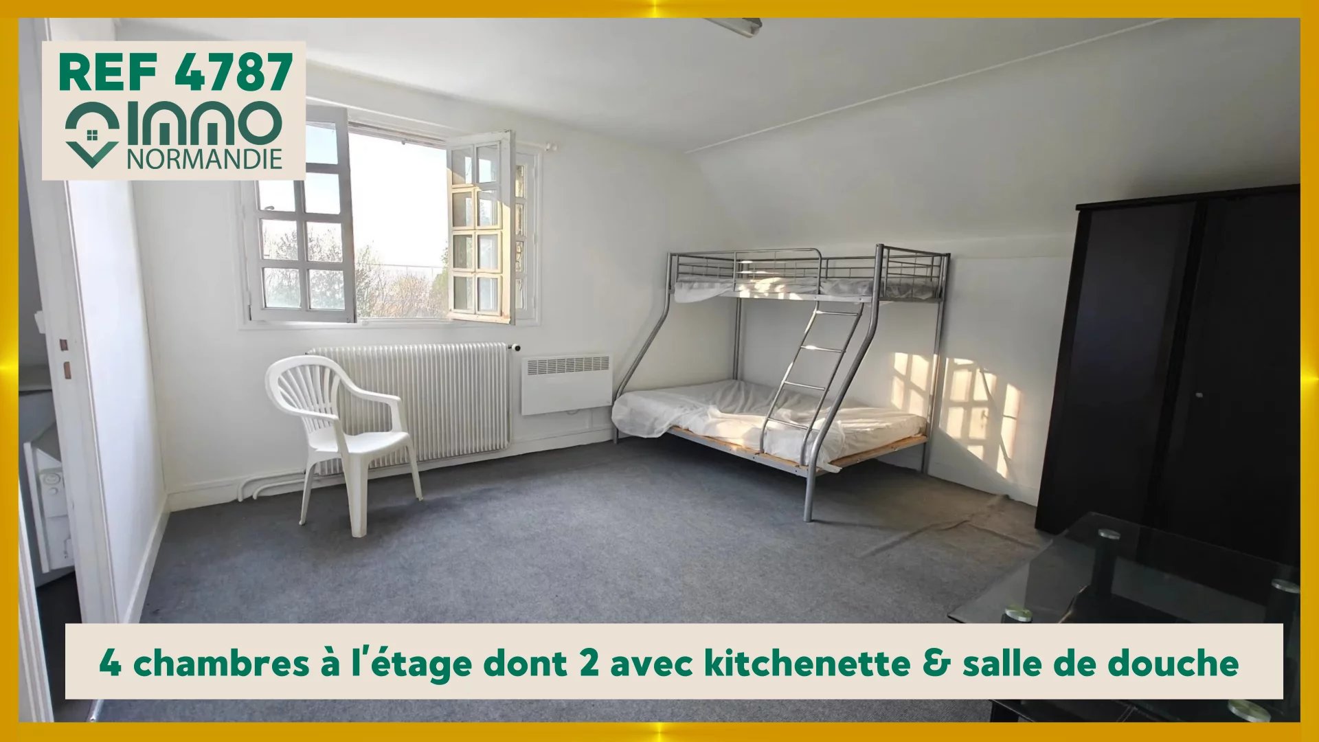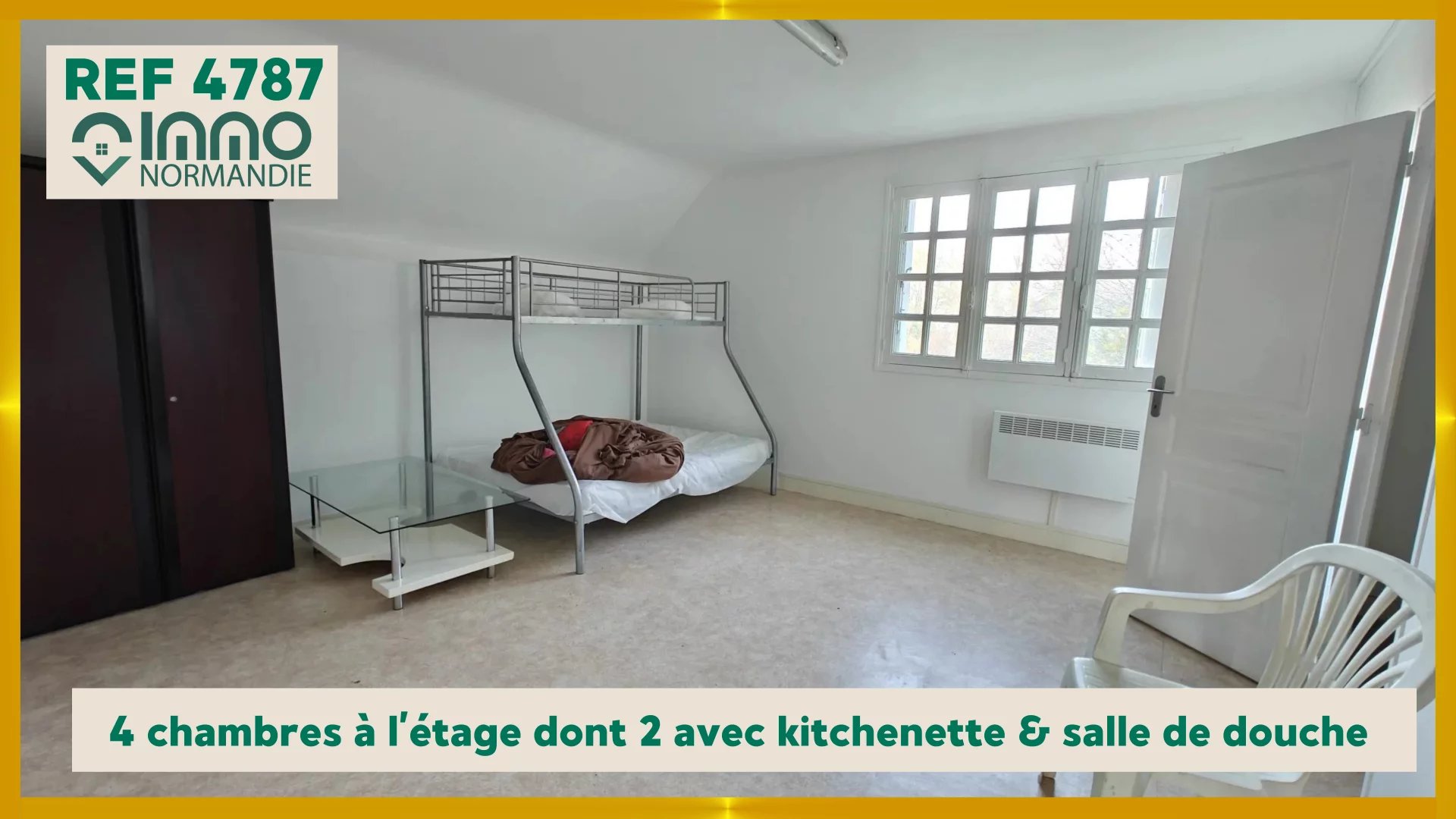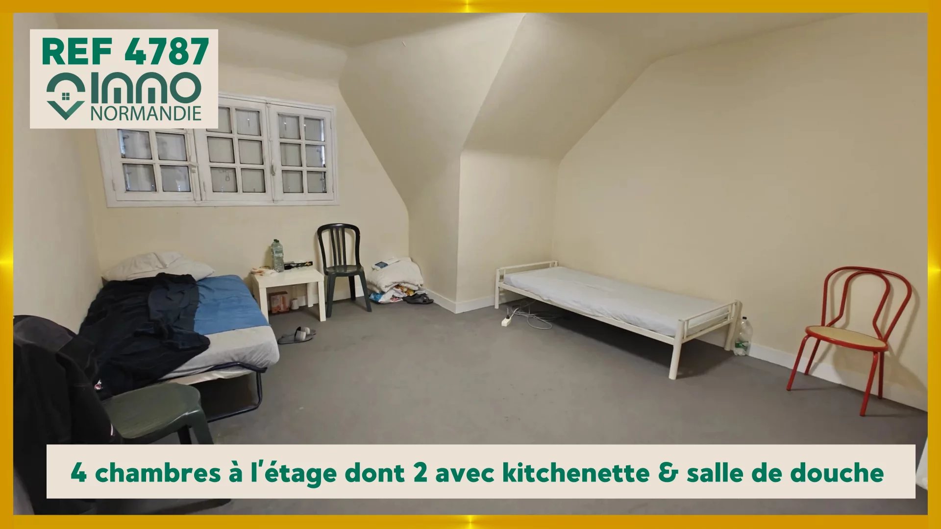 A l'étage ; couloir qui va distribuer 4 chambres dont 2 avec kitchenette & salle de douche, une salle de douche indépendante avec WC.