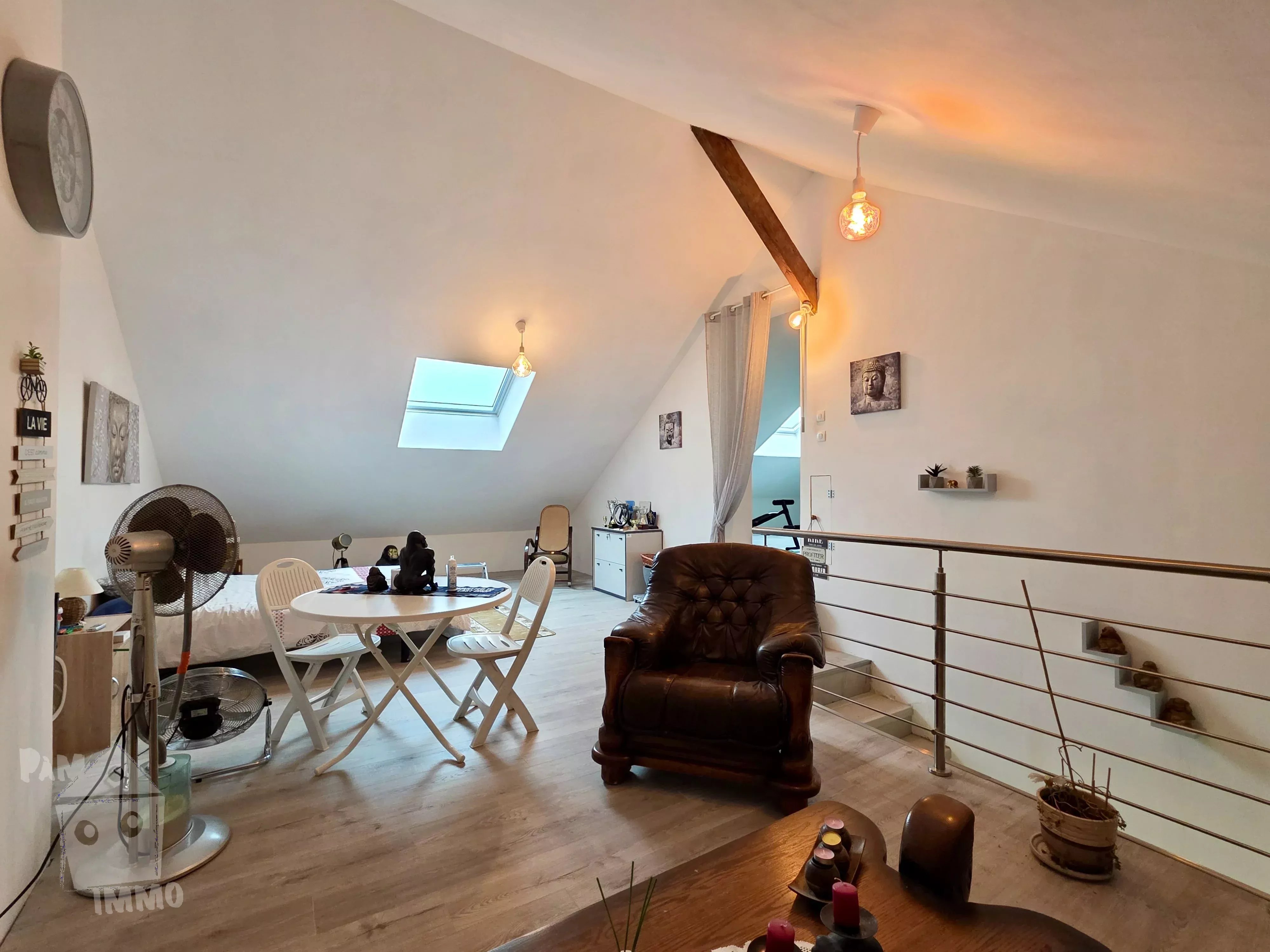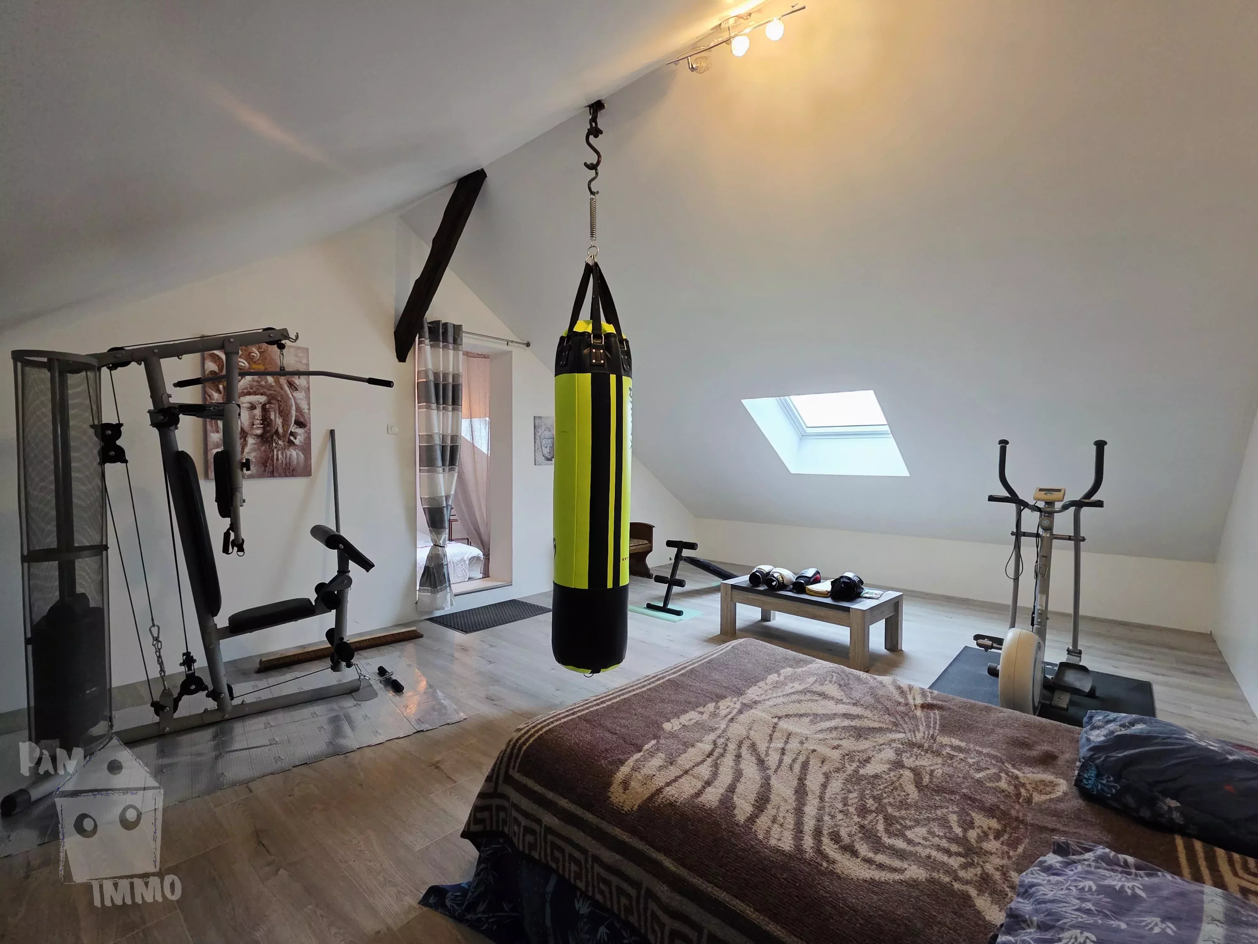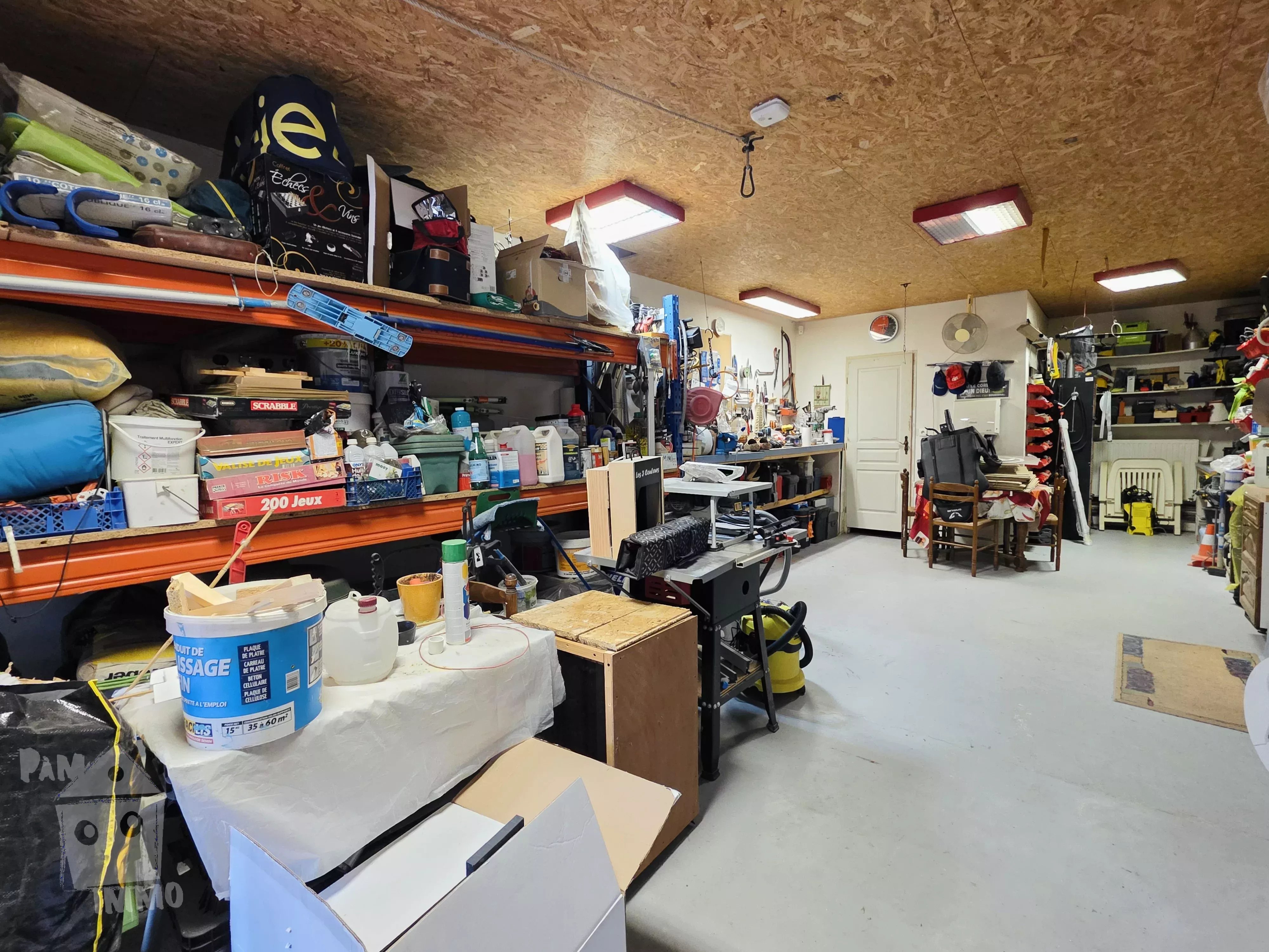 Au premier étage, la maison dispose de deux chambres, d’un WC séparé ainsi que d’un espace atelier d’environ 40 m²