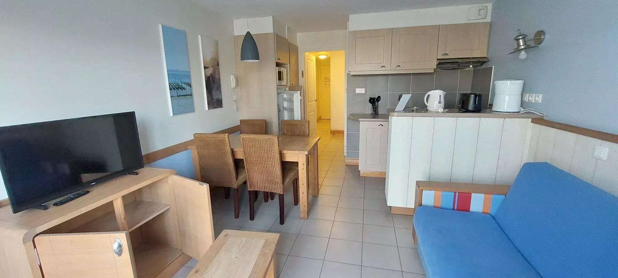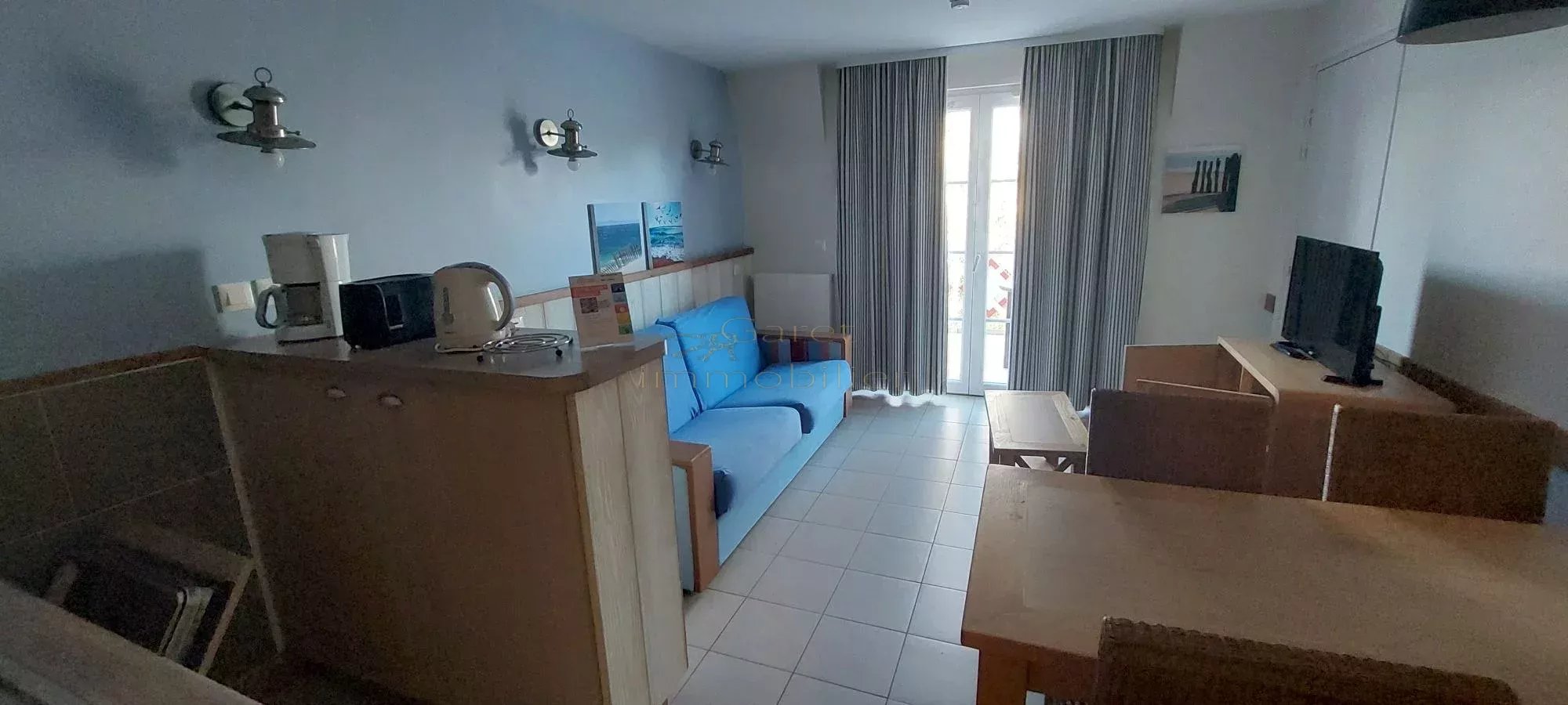 Appartement dans le domaine de Pierre & vacances, comprenant : une entrée, un séjour avec coin cuisine donnant accès sur une terrasse, une chambre, une salle de bain et un toilette. Un emplacement de parking Appartement sous bail , non visitable jusqu’en 2032. Idéal investisseur
