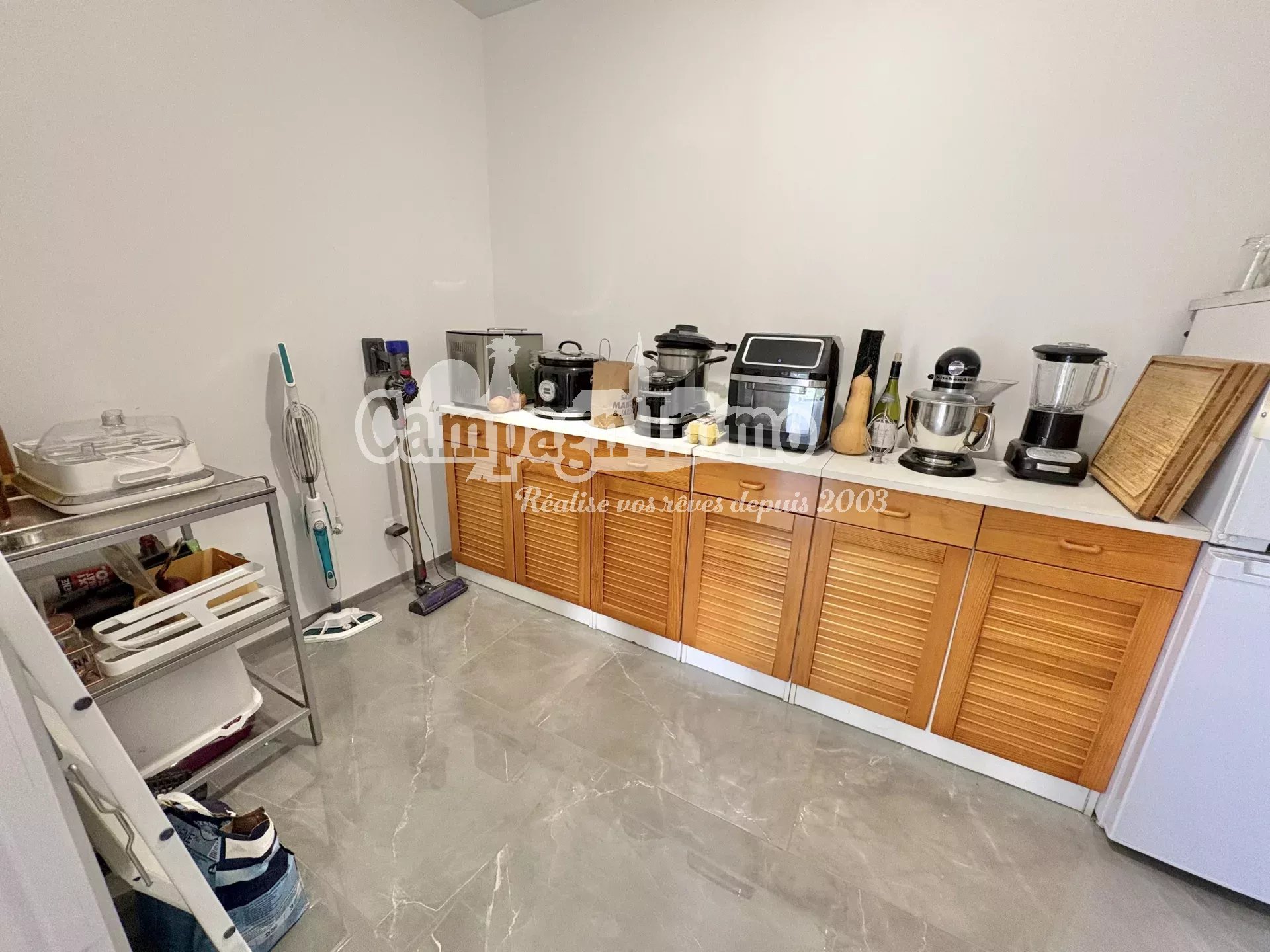 En dessous se trouve la partie habitable principale, de plain pied, donnant sur le jardin. Vous pourrez profiter à ce niveau d'une spacieuse et lumineuse pièce de vie d'environ 60 m² avec cuisine moderne ouverte entièrement équipée, de deux chambres dont une suite parentale avec salle d'eau et dressing, d'un cellier ainsi que d'une salle d'eau à finir d'aménager.