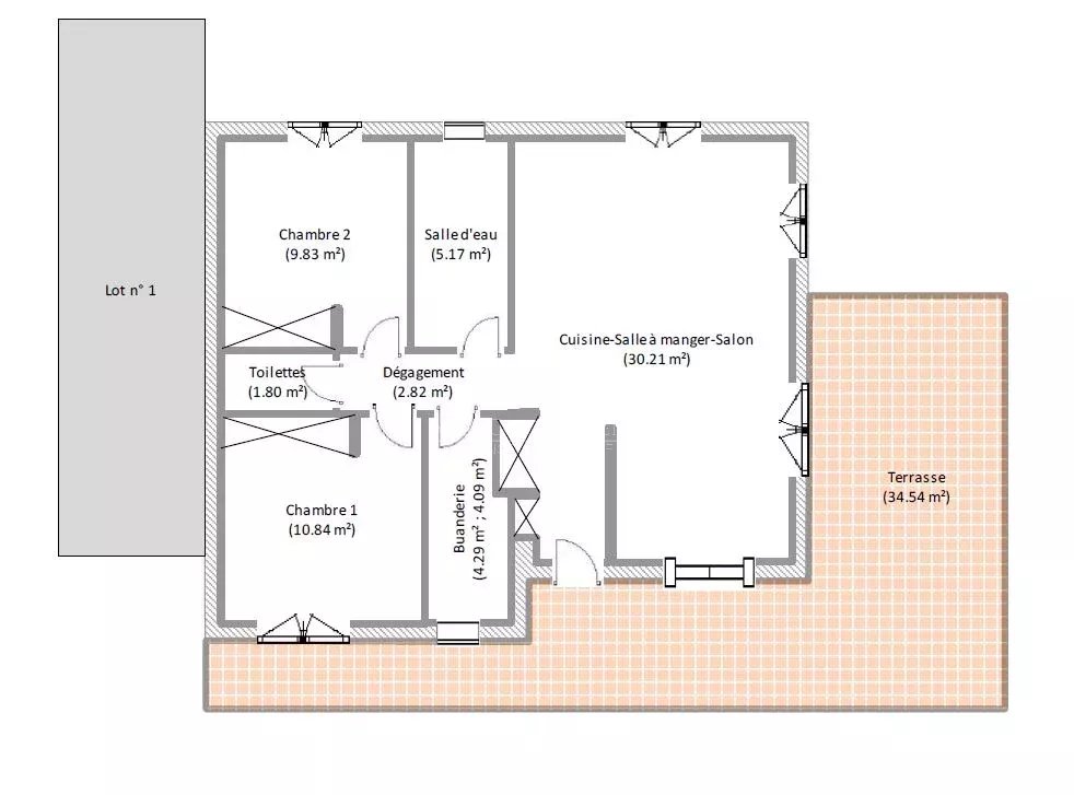 Cette villa moderne, de plain pied, est composée d'une entrée, d'une cuisine ouverte sur salon avec acces terrasse, d'un cellier, de deux chambres avec placards, d'un toilette indépendant avec lave mains et d'une salle d'eau.