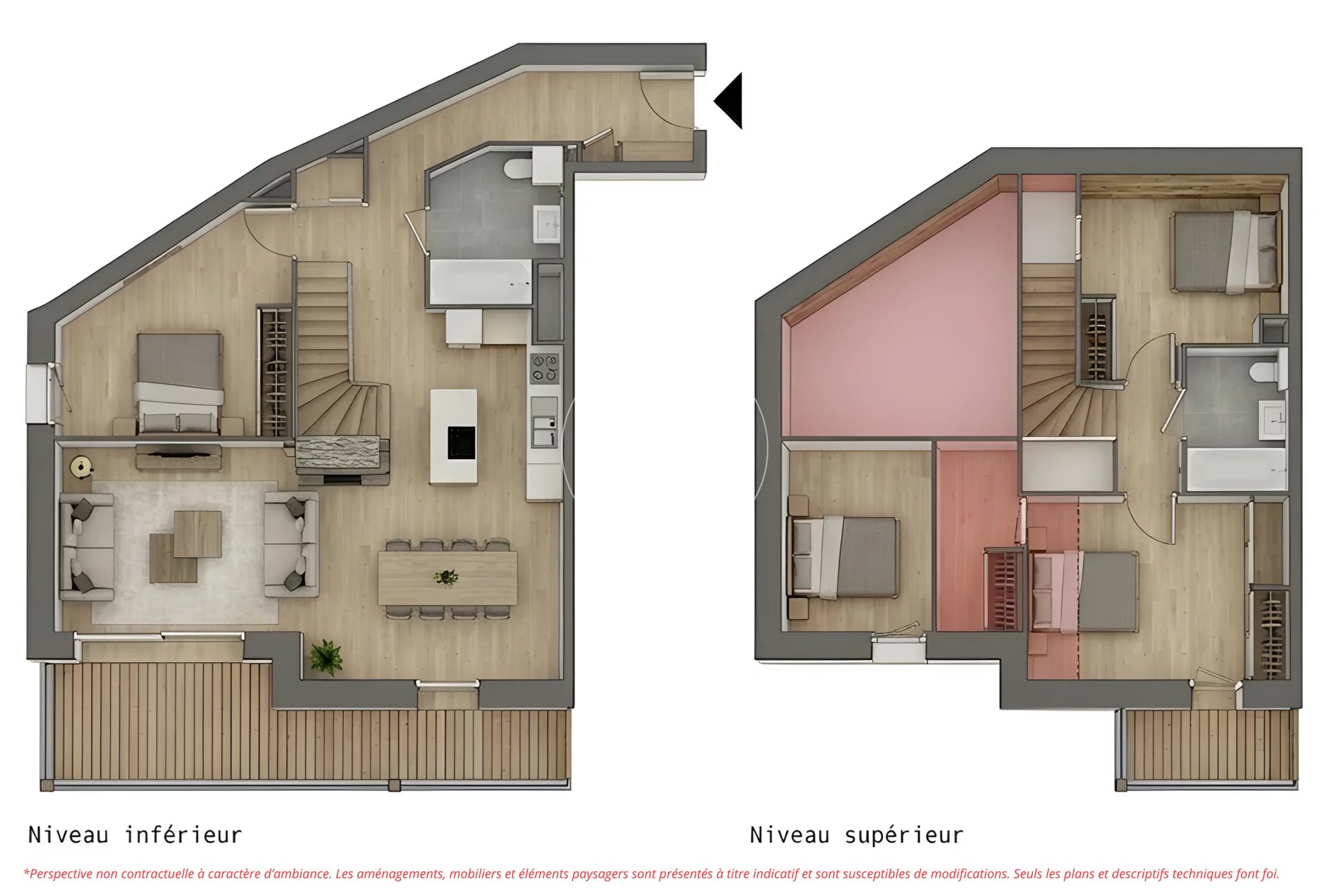 L’appartement duplex 32 est situé aux troisième et quatrième étages du chalet A. Il se compose de trois chambres, d’un vaste séjour avec cuisine ouverte de 37,82 m², de deux salles de bains et d’un cellier.