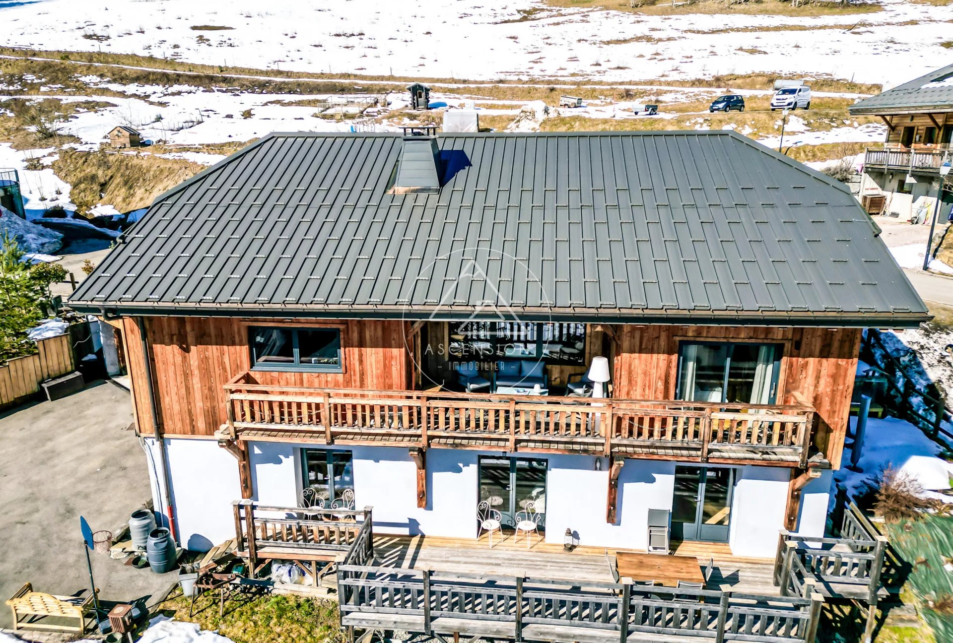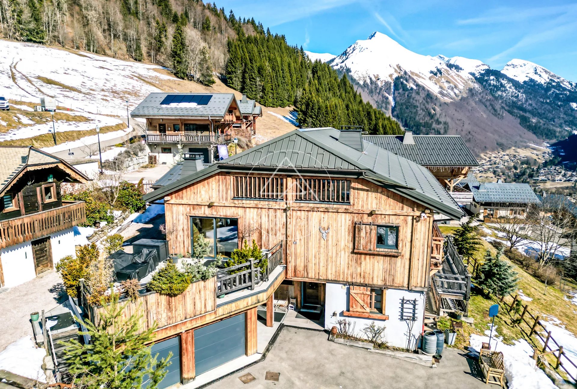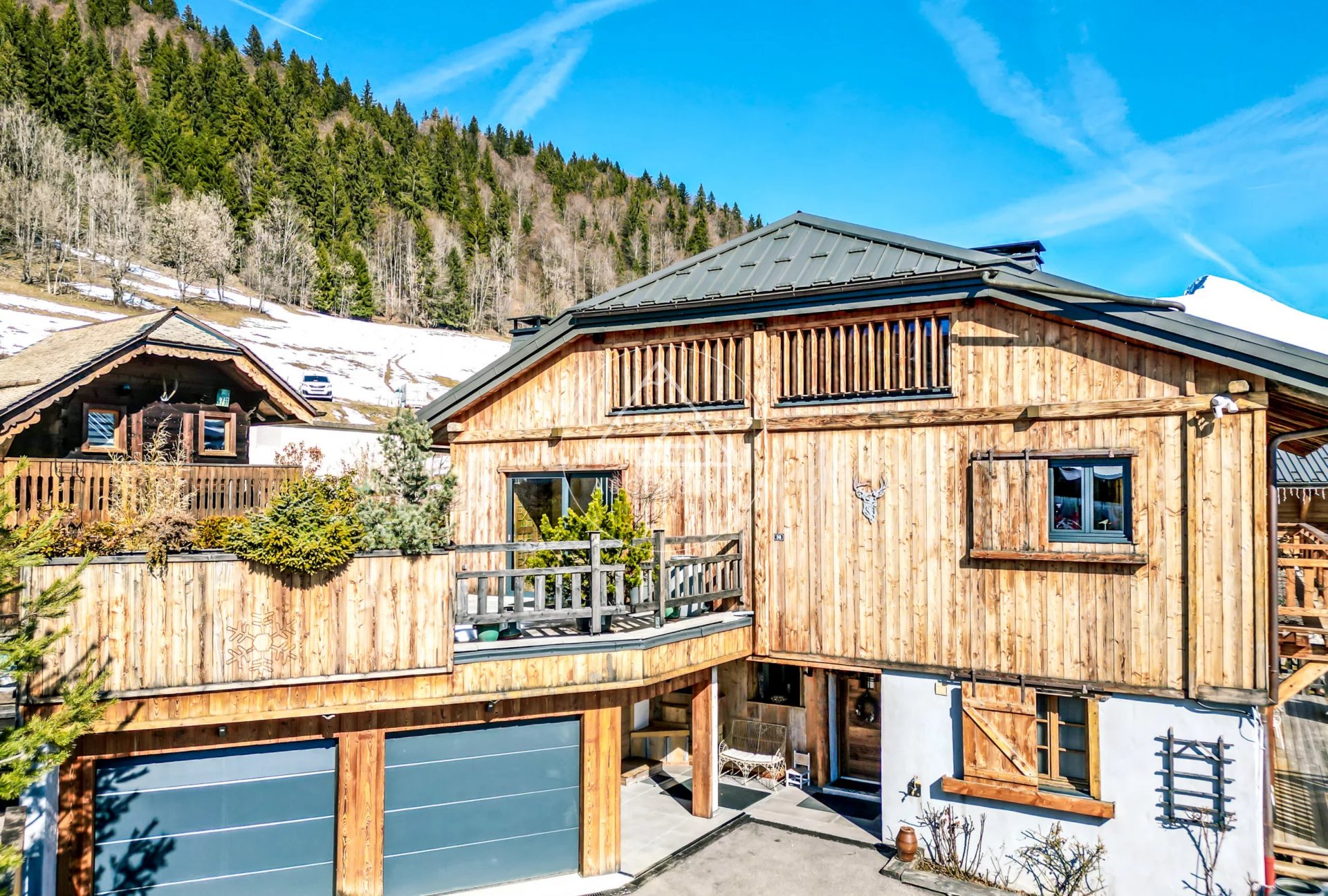 Entièrement repensé avec des matériaux de qualité et une attention remarquable portée aux détails, le chalet offre environ 247 m² habitables, auxquels s’ajoutent une vaste mezzanine et une annexe avec chambre indépendante, le tout édifié sur un terrain de 927 m² bénéficiant d’un ensoleillement optimal grâce à sa position dominante.
