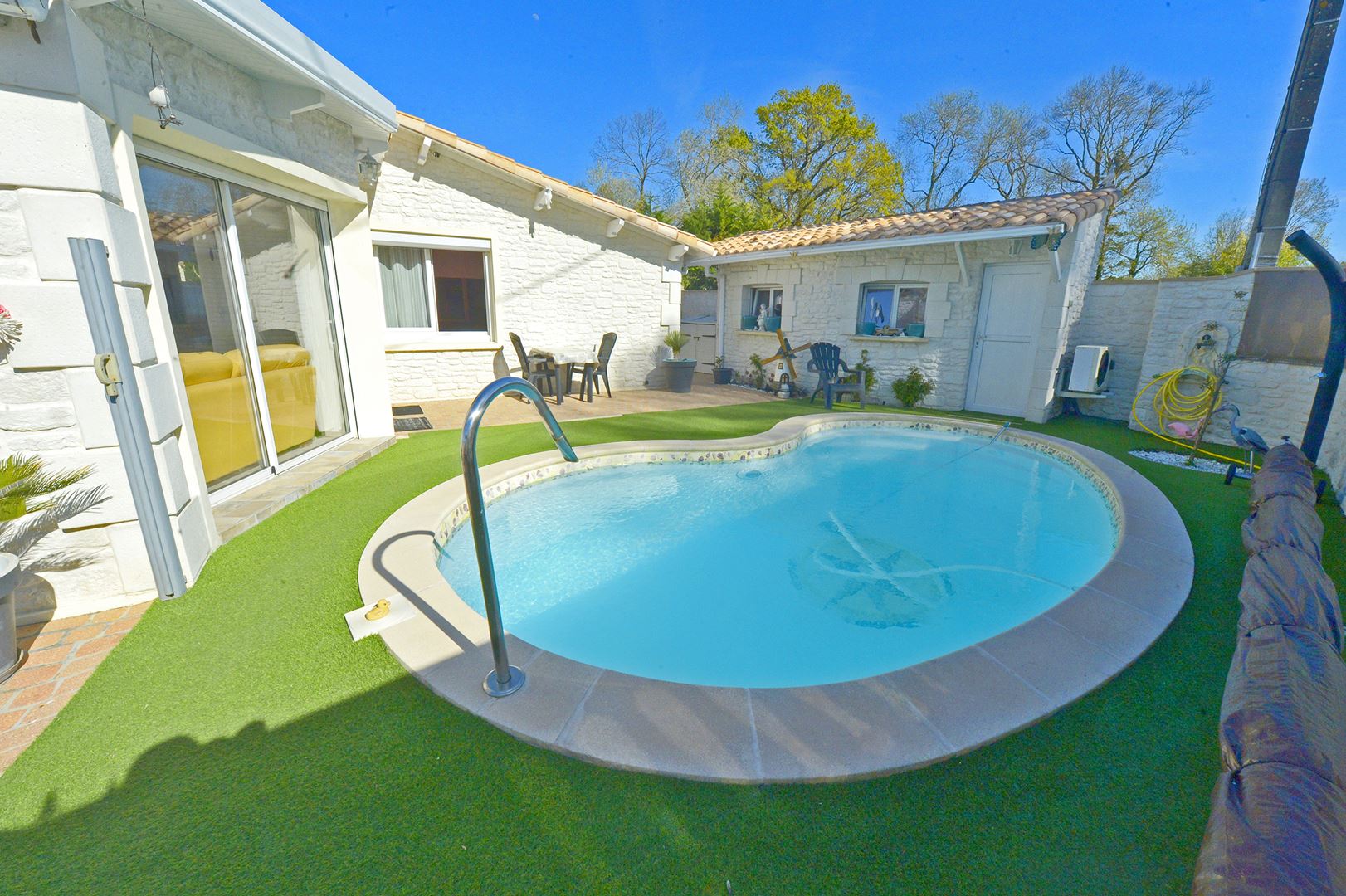 Saint-Sulpice de Royan - Jolie maison d'environ 76m² sur un terrain d'environ 300m², composée d'un salon, séjour, cuisine semi-ouverte, deux chambres avec de grands placards, une salle d'eau, un wc séparé, deux petite dépendances et un grand cagibi. Une petite piscine de 6m x 3m sur un terrain entièrement clos. Au calme proche de la fôret.