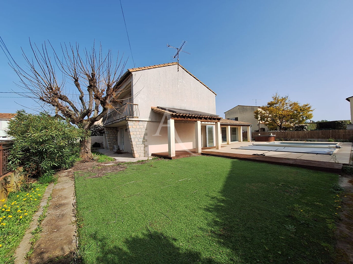 A VENDRE Maison familiale rénovée avec piscine et jacuzzi ? Marguerittes Située dans le charmant village de Marguerittes, à seulement 15 minutes de Nîmes et à proximité de toutes les commodités, cette maison récemment rénovée offre un cadre de vie idéal pour une famille à la recherche de calme, d'espace et de confort. Au rez-de-chaussée, vous découvrirez une cuisine indépendante entièrement équipée, parfaite pour préparer de délicieux repas. Le grand séjour lumineux, agrémenté de poutres apparentes et d'une baie vitrée, invite à la détente et aux moments conviviaux. Ce niveau comprend également une salle d'eau, un WC indépendant, un placard sous escalier, pratique, ainsi qu'un garage. A l'étage, la maison dispose de quatre chambres spacieuses, dont une avec dressing et balcon, idéale pour profiter du soleil . Les autres chambres sont équipées de placards intégrés, offrant un espace de rangement optimisé. Une salle d'eau entièrement refaite et un WC complètent cet étage. Le jardin, exposé plein sud et entièrement clôturé, constitue un véritable espace de détente. Il abrite une piscine de 8 x 4 mètres, entièrement rénovée avec liner neuf, pompe de filtration et électrolyseur, idéale les belles journées d'été. Un jacuzzi 4 places vient parfaire cet espace pour des moments de relaxation. Parmi ses atouts, cette maison bénéficie de beaux volumes, notamment dans la cuisine et le séjour, et est équipée d'un ballon thermodynamique, de climatisations réversibles et d'un forage, garantissant confort et qualité de vie au quotidien. Cette maison est idéale pour une famille recherchant un cadre de vie paisible tout en restant proche de la ville. A visiter sans tarder ! Honoraires d'agence à la charge du vendeur. Performance énergétique : Classe ÉNERGIE C (indice 110) ? Classe CLIMAT C (indice 22). Les informations sur les risques auxquels ce bien est exposé sont disponibles sur le site [www.georisques.gouv.fr](http://www.georisques.gouv.fr).