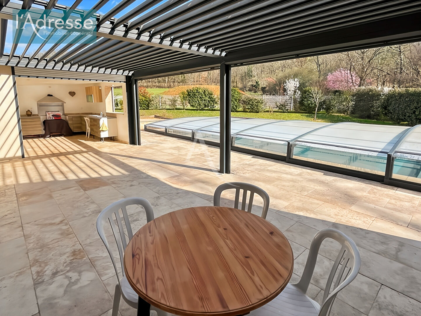Située dans un environnement privilégié, cette superbe propriété contemporaine de plain-pied d'environ 207 m² séduit immédiatement par ses volumes généreux et la qualité de ses prestations. L'entrée ouvre sur un magnifique espace de vie baigné de lumière, composé d'un vaste séjour chaleureux avec poêle à bois, prolongé par une cuisine ouverte, moderne et parfaitement équipée. Une mezzanine surplombe cet espace et offre un lieu idéal pour un bureau ou un espace détente. L'espace nuit a été pensé pour le confort de toute la famille. Il comprend une suite parentale avec dressing et salle de bain privative, ainsi que trois chambres supplémentaires, une salle d'eau, et deux toilettes indépendantes. Un cellier et une buanderie viennent compléter les espaces fonctionnels de la maison. A l'extérieur, les prestations invitent pleinement à profiter de la douceur de vivre : cuisine d'été avec WC, grande terrasse conviviale équipée d'une pergola bioclimatique. Les dépendances comprennent un double garage, un atelier aménagé et un abri voiture, offrant de multiples possibilités de rangement ou d'aménagement. L'ensemble s'épanouit sur un magnifique terrain paysagé de 1 800 m², agrémenté d'une piscine au sel avec local technique, dans un cadre calme et privilégié. Une propriété alliant confort, élégance et qualité de vie.
