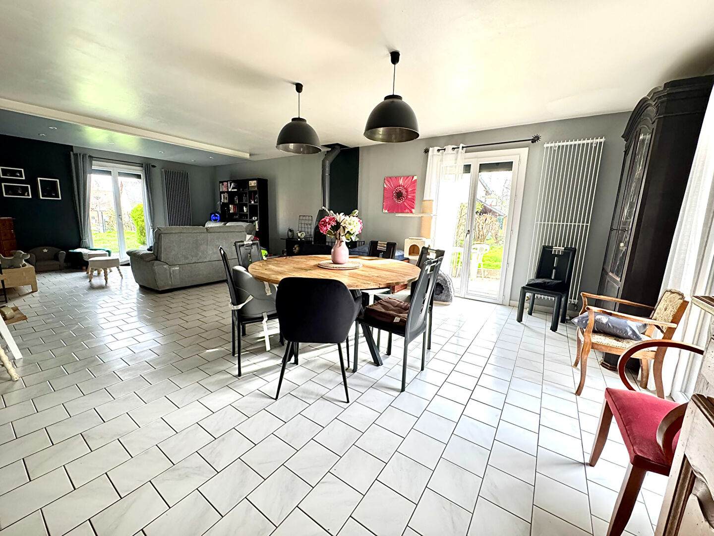 A proximité du SIVOM, pavillon individuel et très fonctionnel de 142 m² SH vous offrant au RDC : Un hall d'entrée, une belle pièce de vie de 59 m² comprenant une cuisine aménagée-équipée ouverte sur un séjour-salon avec poêle à bois, une chambre de 9 m², un WC indépendant. A l'étage : Un dégagement desservant 3 belles chambres, une salle de douches, un bureau, un dressing, une salle de bains avec WC. Agréable terrain entièrement clos et sans vis à vis de 2134 m² (non divisible) avec terrasse et pergola. 2 garages et un atelier attenant. Belles prestations : Volets roulants électriques solaires, isolation toiture en 2022, ouvrants changés... RARE A LA VENTE ! (4.71 % honoraires TTC à la charge de l'acquéreur.)
