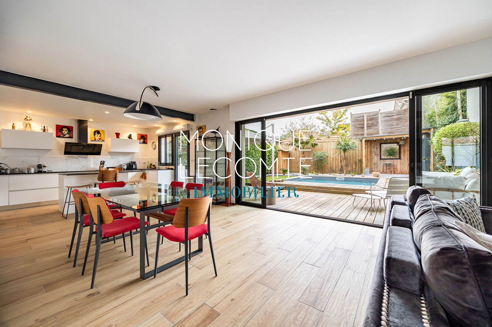 EXCLUSIVITÉ Bordeaux - Le Bouscat, l'agence Monique Lecomte Immobilier vous propose à la vente cette belle maison des années 70 entièrement rénovée en 2021 en plein centre du Bouscat d'environ 200m2 sur une parcelle arborée de 252 m2. Elle se compose au rez-de-chaussée d'une entrée, un vaste séjour de 60 m2 avec cuisine ouverte ouvrant sur le jardin et une piscine chauffée exposés plein Sud. A l'étage un pallier distribue une suite parentale de plus de 30 m2 avec dressing et salle de bains ainsi qu'une mezzanine, 3 chambres, une buanderie et une salle d'eau. Un garage et une cuisine d'été complètent cette maison à proximité immédiate des commerces du centre, des écoles de renom et des transports. (3.92 % honoraires TTC à la charge de l'acquéreur.)