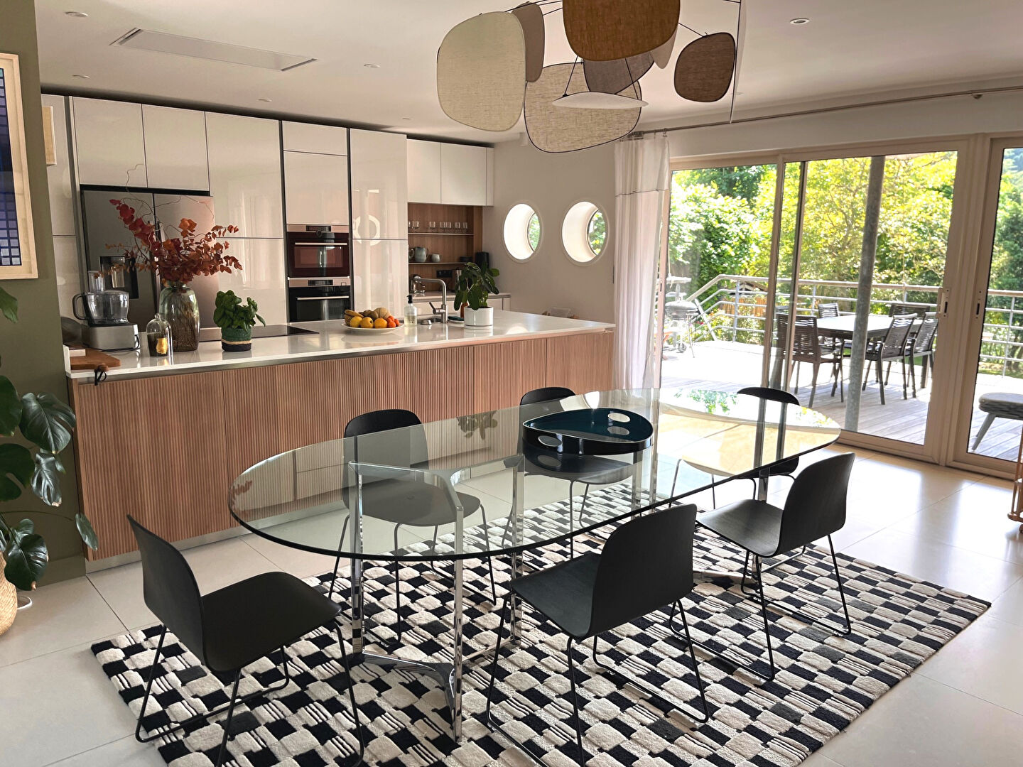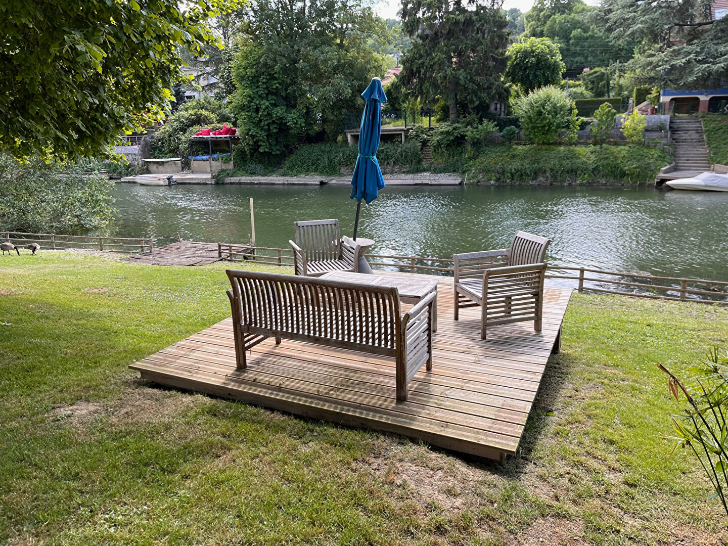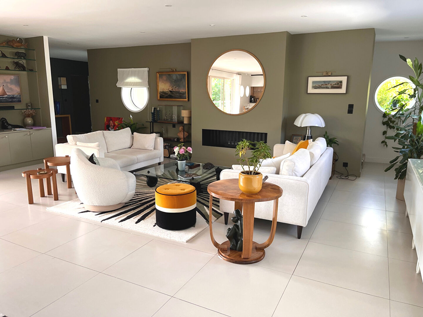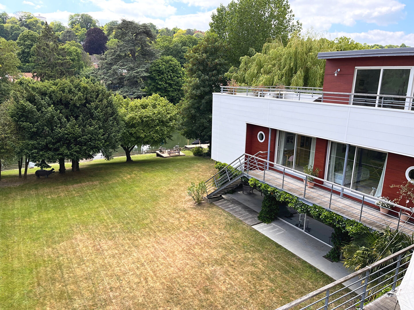 L'Agence ARRIO vous propose sur l'île de Villennes, dans un environnement privilégié une maison d'architecte du début des année 2000 exposée Sud-Ouest. De plein pied se trouve un grand séjour avec cuisine ouverte (56 m²) donnant sur une grande terrasse, une suite parentale de 30 m² avec dressing, salle de bain et douche. Toujours de plein pied, 4 autres chambres avec 2 salles de bain. A l'étage une magnifique pièce bureau - bibliothèque idéal pour une salle destinée à votre passion ou profession. En rez-de-jardin salle de sport, sauna et billard. Garage et stationnements couverts. (5.00 % honoraires TTC à la charge de l'acquéreur.)
