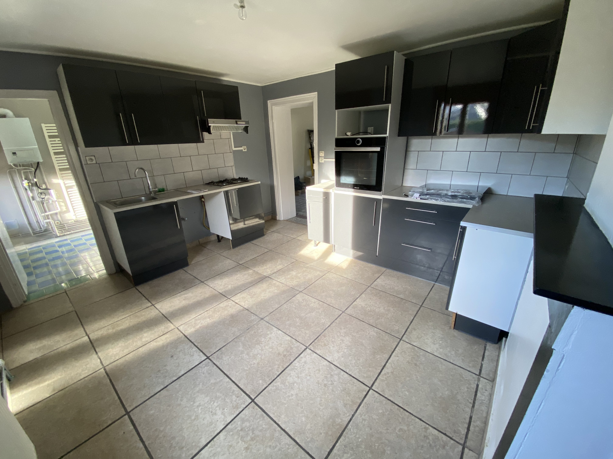 Maison individuelle située à Sebourg comprenant : un séjour, une cuisine aménagée (plaques, four, hotte) donnant sur la terrasse et le jardin,