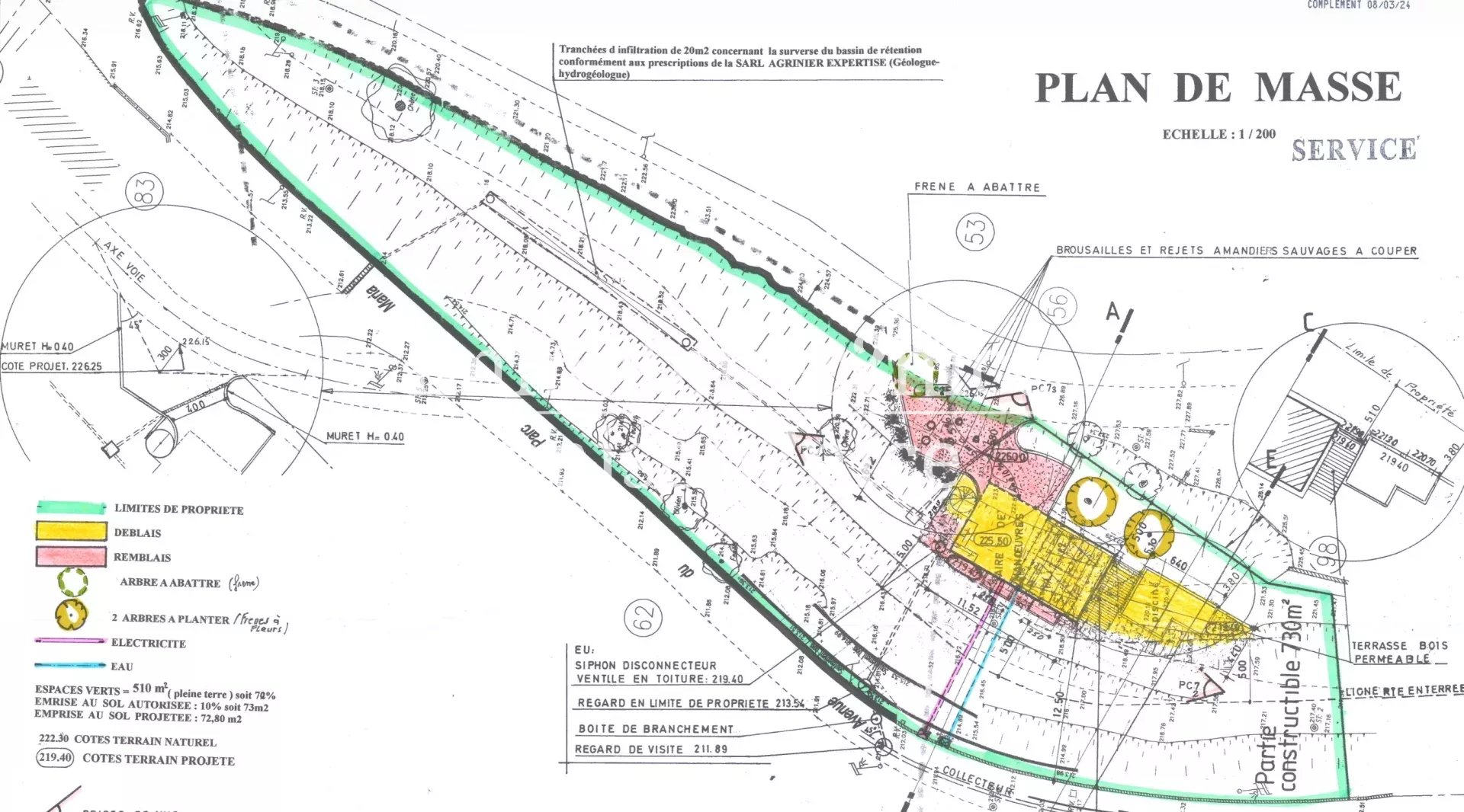 D’une superficie totale d’environ 1 985 m², il se compose d’une partie constructible et d’une partie naturelle préservée. Implanté en restanques orientées vers l’ouest, il profite d’une vue dégagée sur les collines environnantes.
