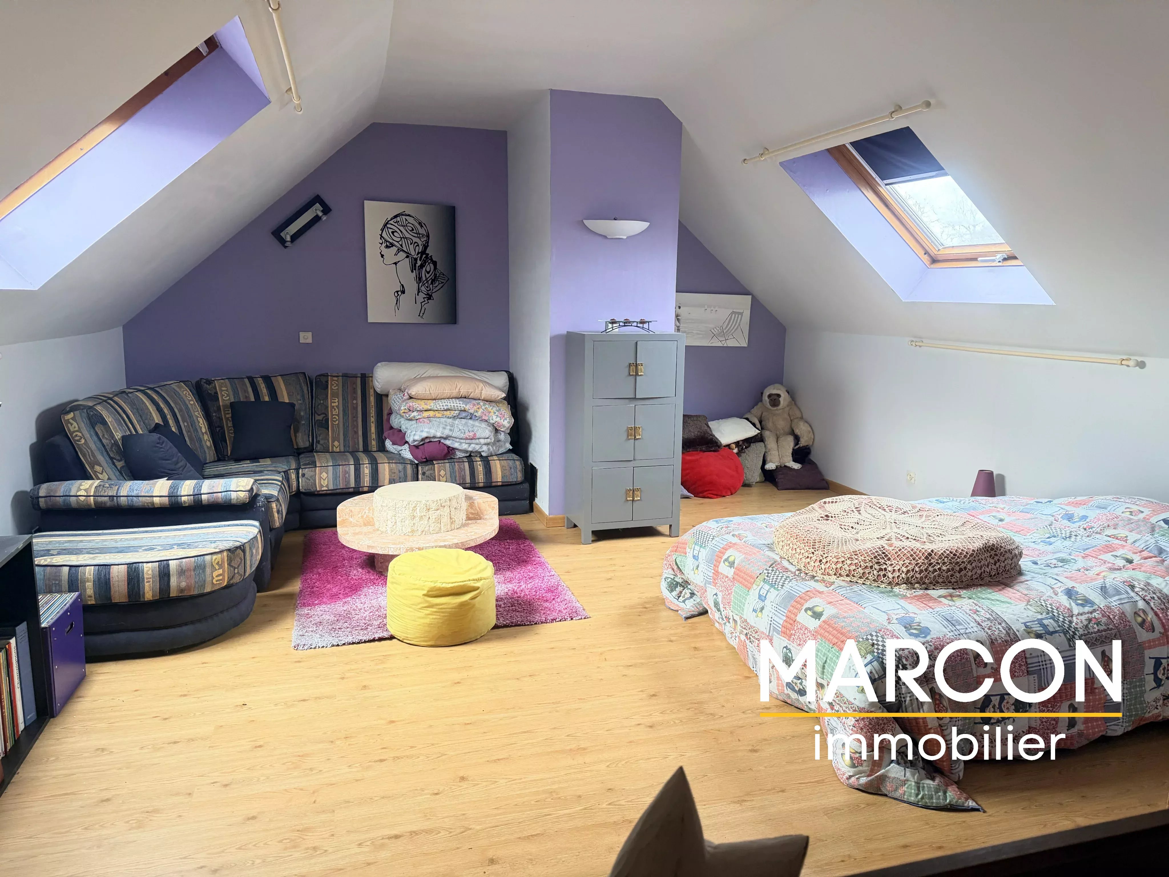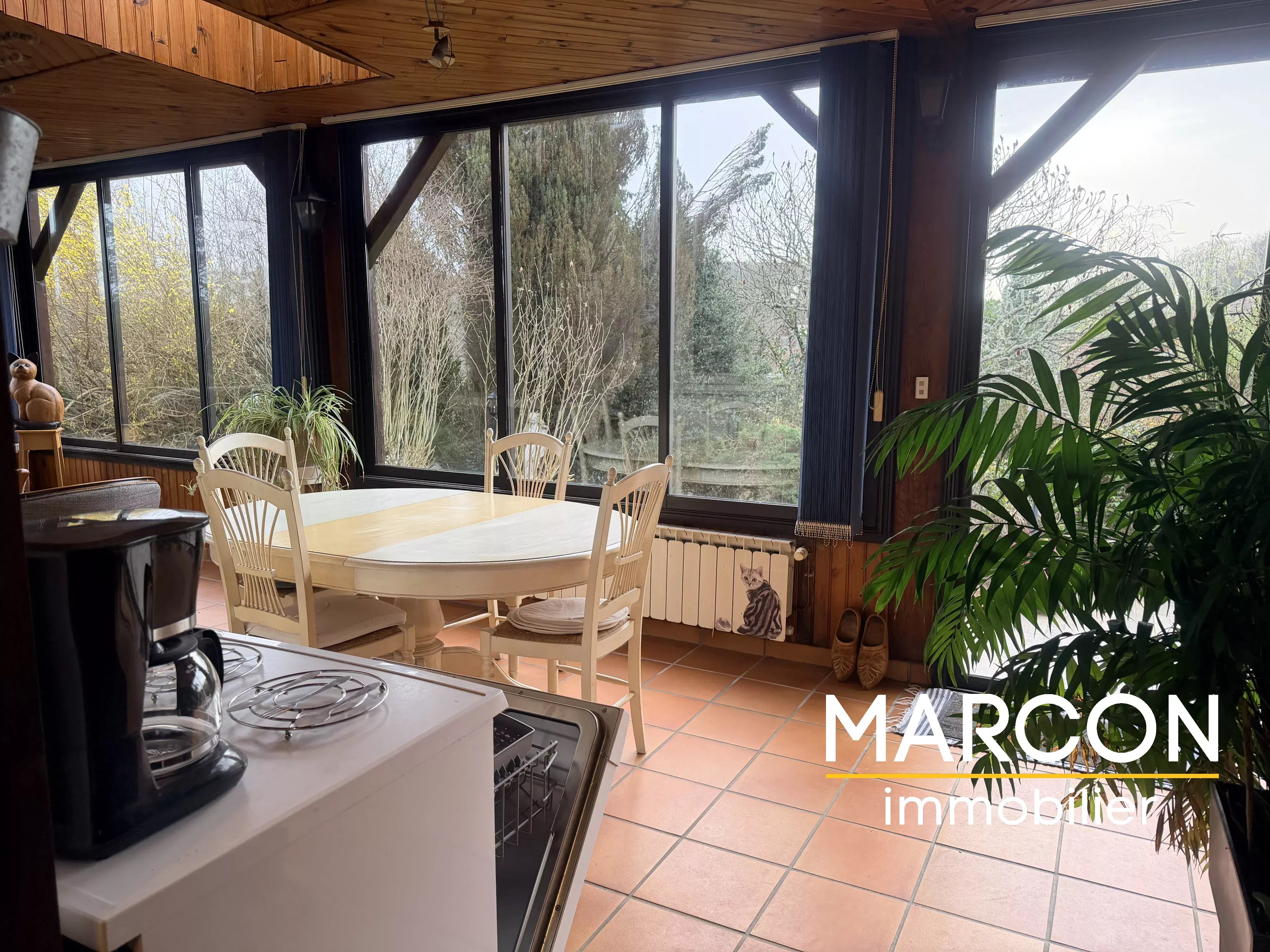 Le rez-de-chaussée comprend cuisine équipée/séjour de 33.5 m² avec poêle à bois avec accès direct à une véranda chauffée de 35 m², 3 chambres, salle de bains + WC, dégagement.