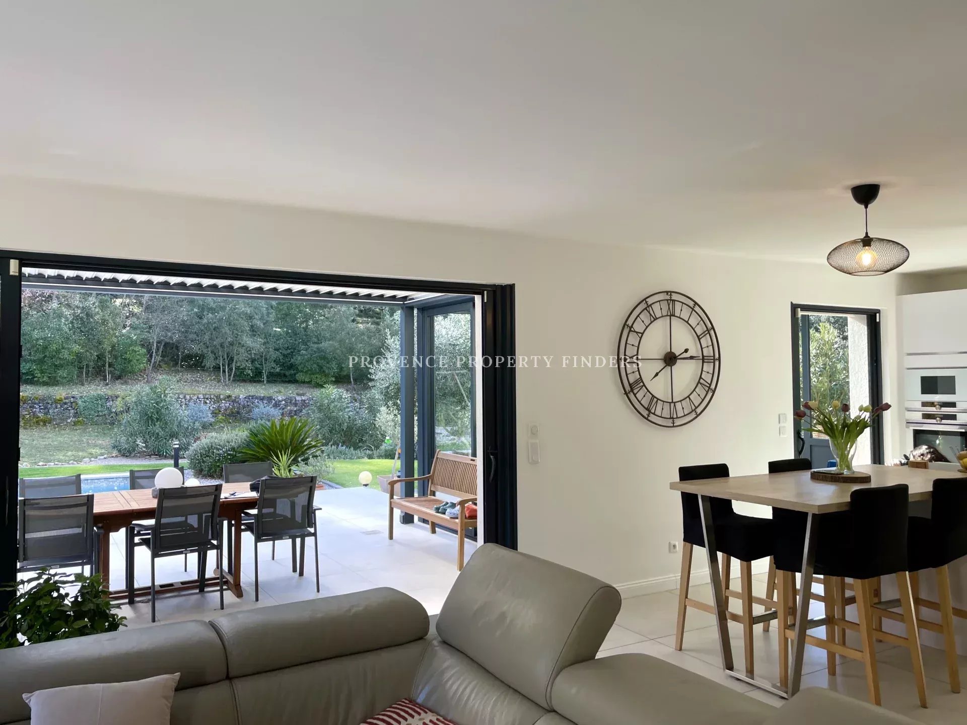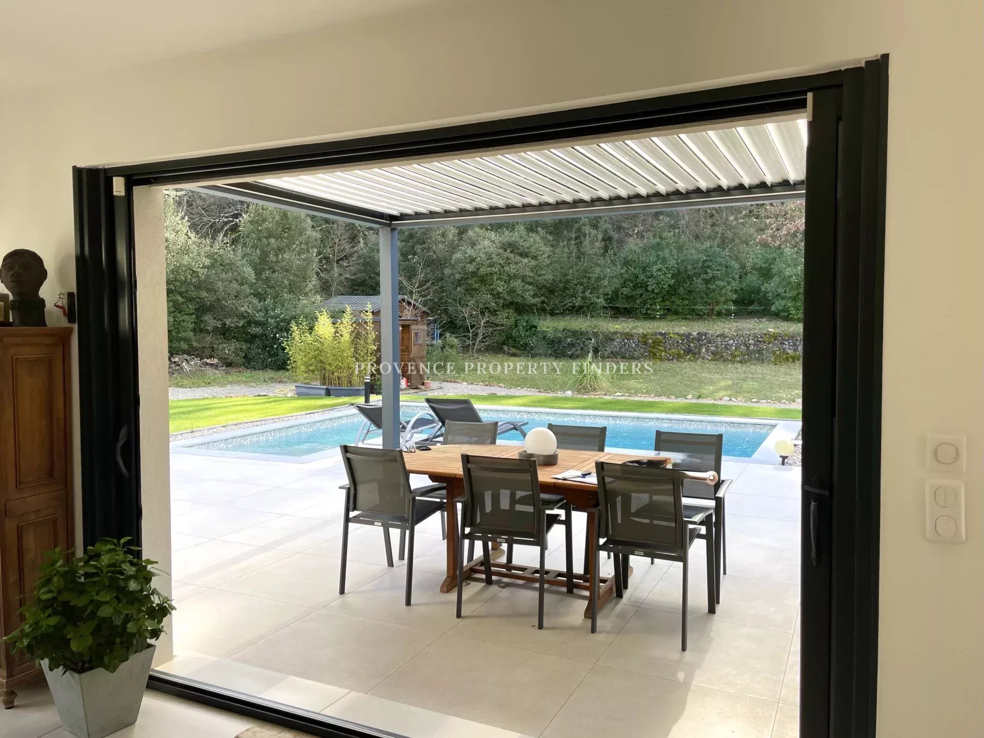 Pensée pour le confort moderne, la propriété est équipée d’un chauffage au sol sur l’ensemble de la maison via une pompe à chaleur, ainsi que de la climatisation. À l’extérieur, une terrasse bioclimatique prolonge les espaces de vie et permet de profiter pleinement du climat provençal. Le jardin accueille également une piscine et la maison dispose d’un garage.
