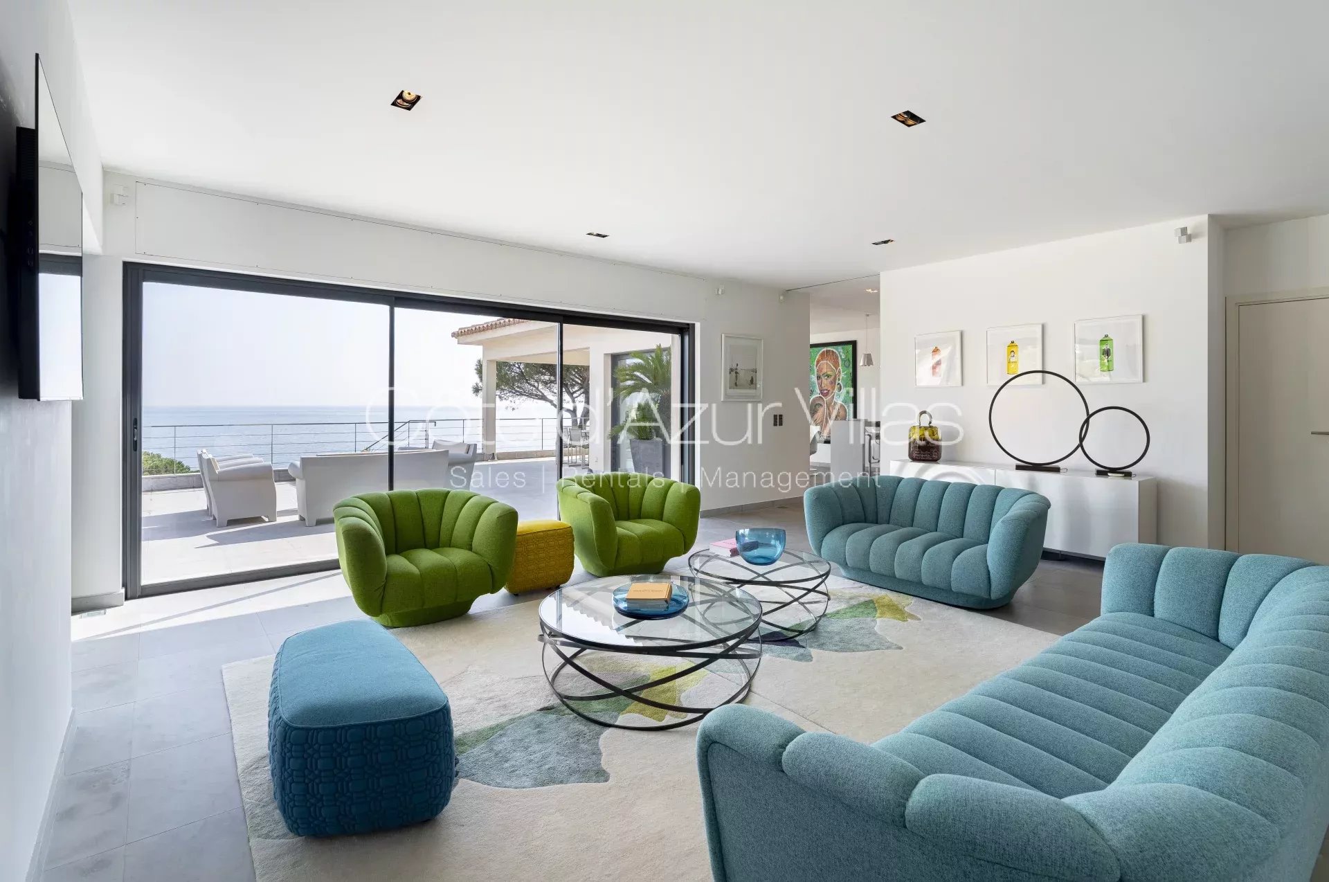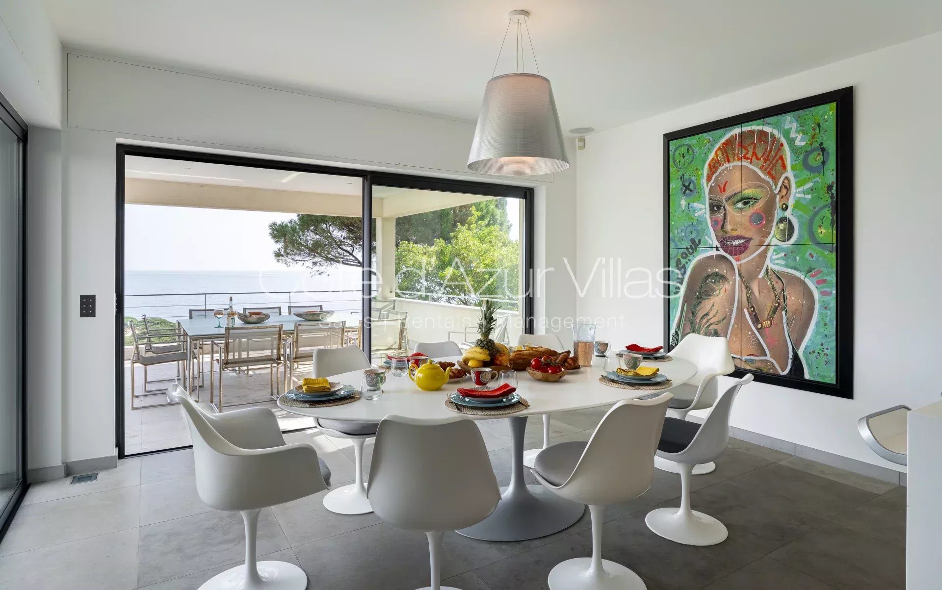 Le vaste salon / salle à manger et cuisine ouverte est baigné de lumière grâce à de grandes baies vitrées qui offrent une vue imprenable sur la Méditerranée. Une grande terrasse prolonge harmonieusement cette grande pièce à vivre, jusqu'à la mer et au-delà des pins.