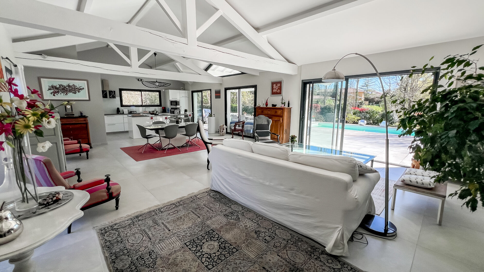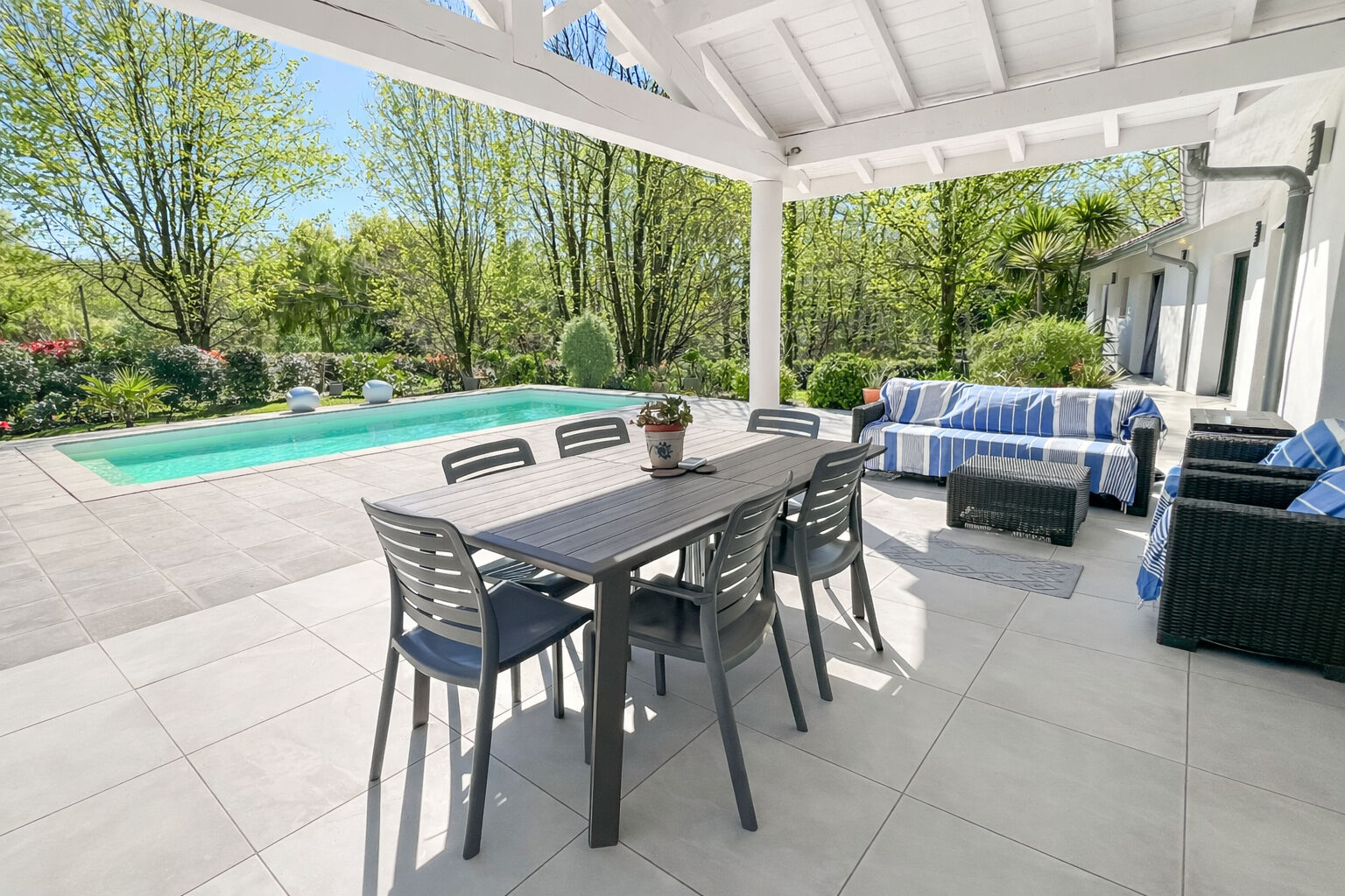 À seulement 1 km des nombreuses commodités du village de Saint-Martin-de-Seignanx, tout en bénéficiant d'un environnement naturel privilégié face à la forêt, découvrez cette superbe villa d'architecte de plain-pied, construite en 2013 avec de très belles prestations comme le chauffage pompe à chaleur. Développant environ 180 m² habitables, cette maison contemporaine séduit par ses volumes généreux et sa luminosité exceptionnelle grâce à de nombreuses et larges baies vitrées ouvertes sur le jardin, la grande terrasse et la piscine. La pièce de vie, spacieuse et conviviale, accueille une grande cuisine américaine ouverte sur le séjour. L'espace nuit se compose de quatre chambres, chacune disposant de sa propre salle d'eau, offrant confort et intimité à tous les occupants. À l'extérieur, la villa s'ouvre sur un bel espace terrasse avec piscine chauffée, sans vis-à-vis, profitant d'une agréable vue sur la végétation et la forêt. L'ensemble est implanté sur un terrain d'environ 2 000 m², garantissant calme et tranquillité. Idéalement située, la propriété se trouve à 10 km des plages landaises et de Bayonne, offrant un cadre de vie alliant calme, nature et proximité des grands axes. Entrée de l'autoroute à 6km et bus des plages à proximité. Une propriété rare, idéale pour les amoureux de nature souhaitant rester à proximité immédiate des commodités et du littoral. Honoraires agence de 5% charge acquéreur inclus dans le prix. (5.00 % d'honoraires TTC à la charge de l'acquéreur.).Informations LOI ALUR : Honoraires : 5 % TTC charge acquéreur. Prix hors honoraires : 730 000 ¤. (gedeon_33231_32805777)