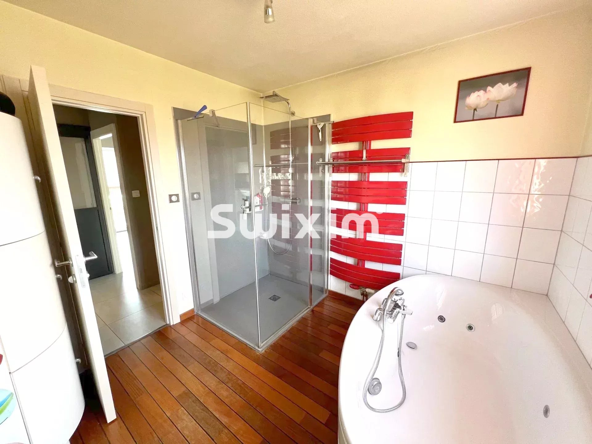 Côté nuit, la maison propose plusieurs chambres confortables ainsi qu’une salle de bains spacieuse avec baignoire et douche, complétée par une douche à l’italienne plus récente et des WC suspendus. De nombreux travaux ont été réalisés : isolation renforcée, électricité refaite, menuiseries PVC double vitrage, volets roulants, VMC, et équipements énergétiques performants incluant pompe à chaleur, chaudière bois et chauffe-eau thermodynamique. Toutes les portes intérieures ont également été remplacées, apportant une touche moderne et soignée à l’ensemble.