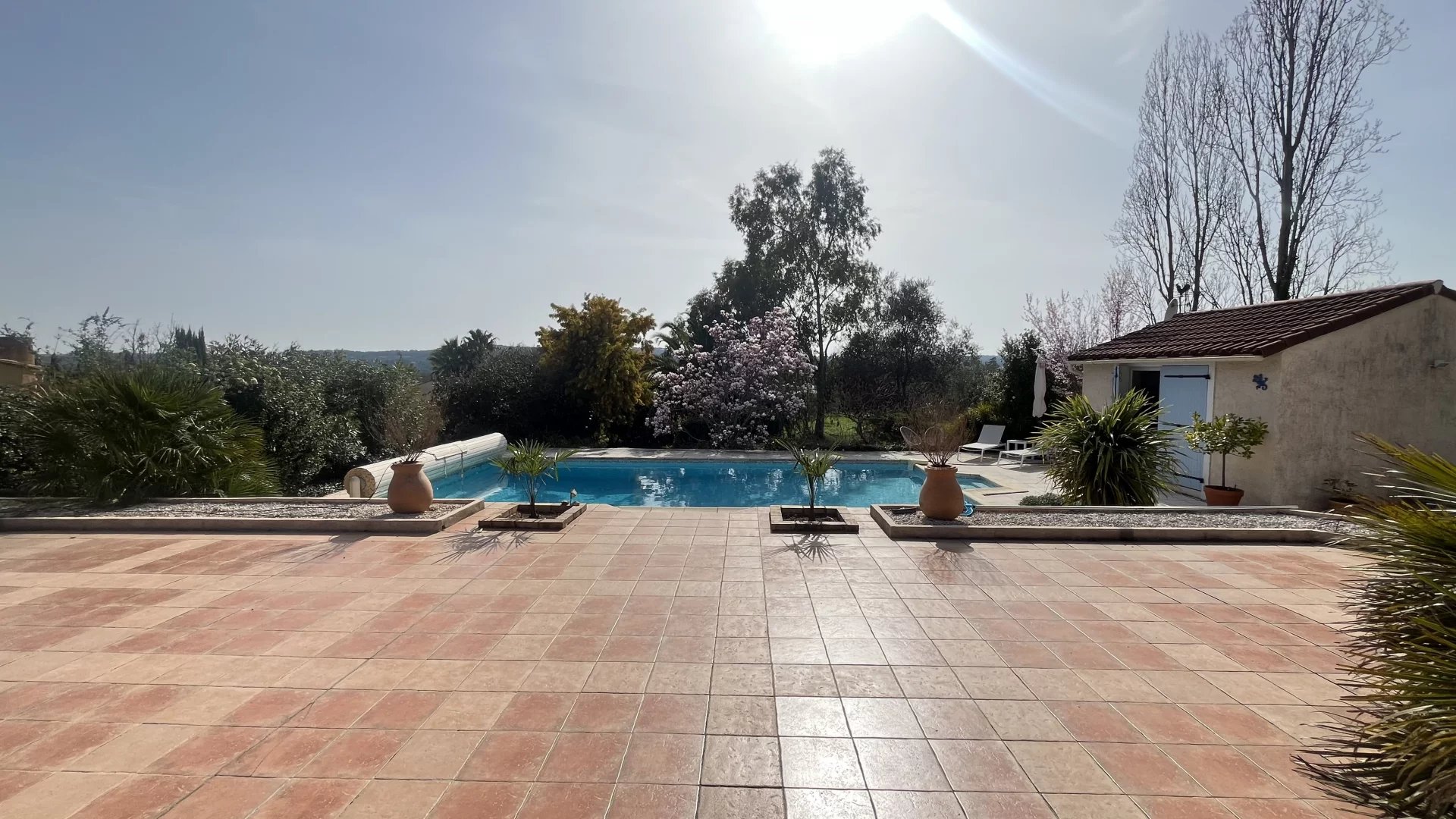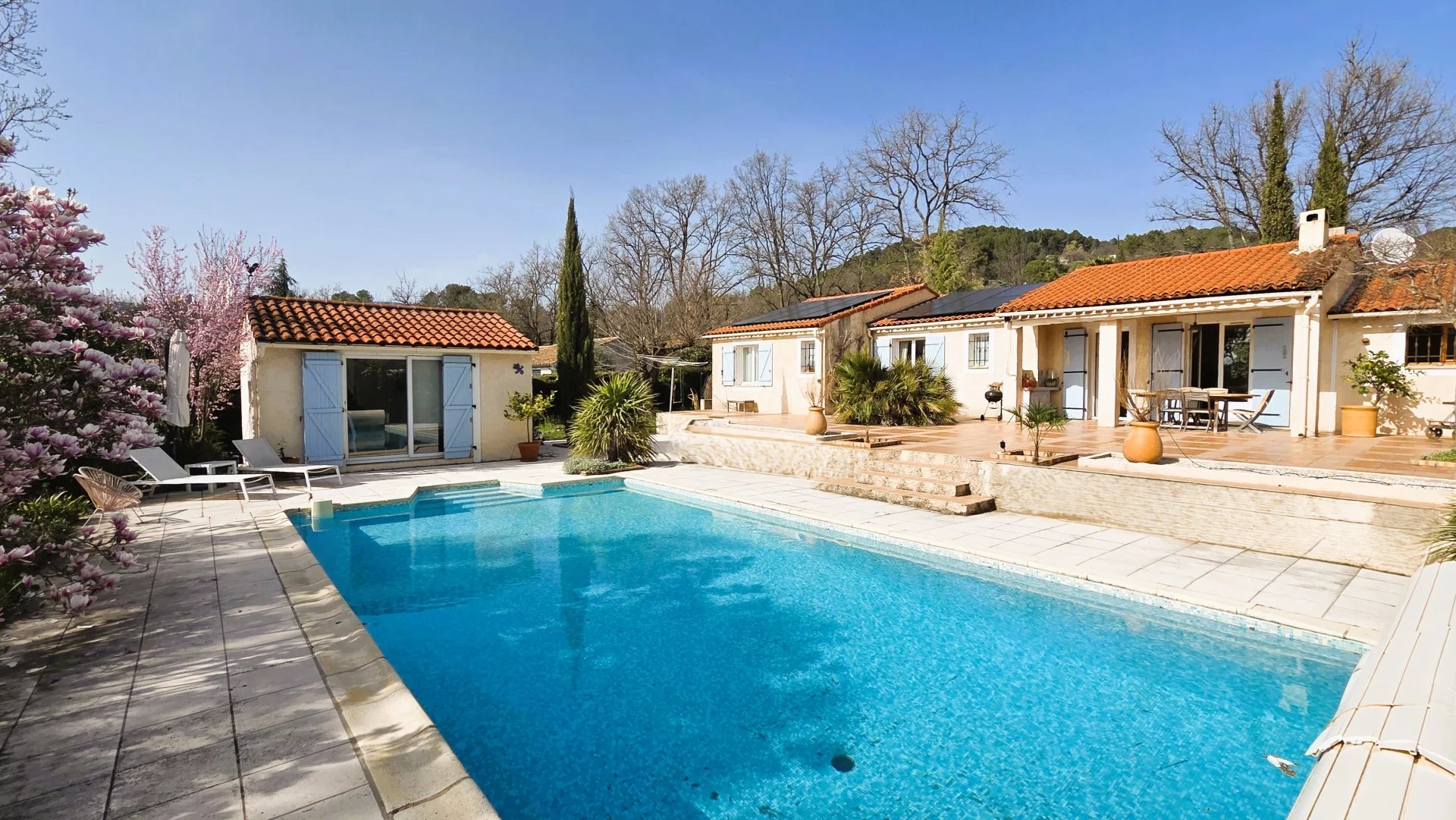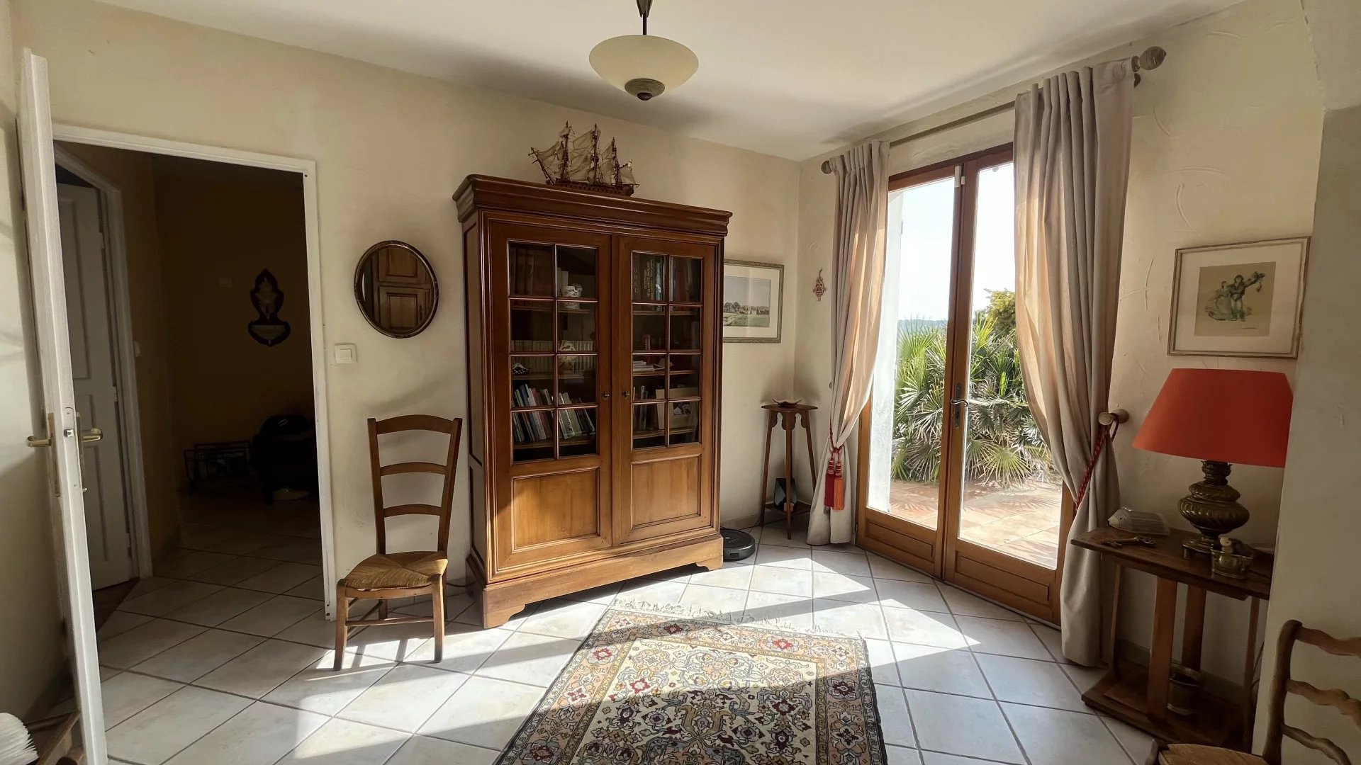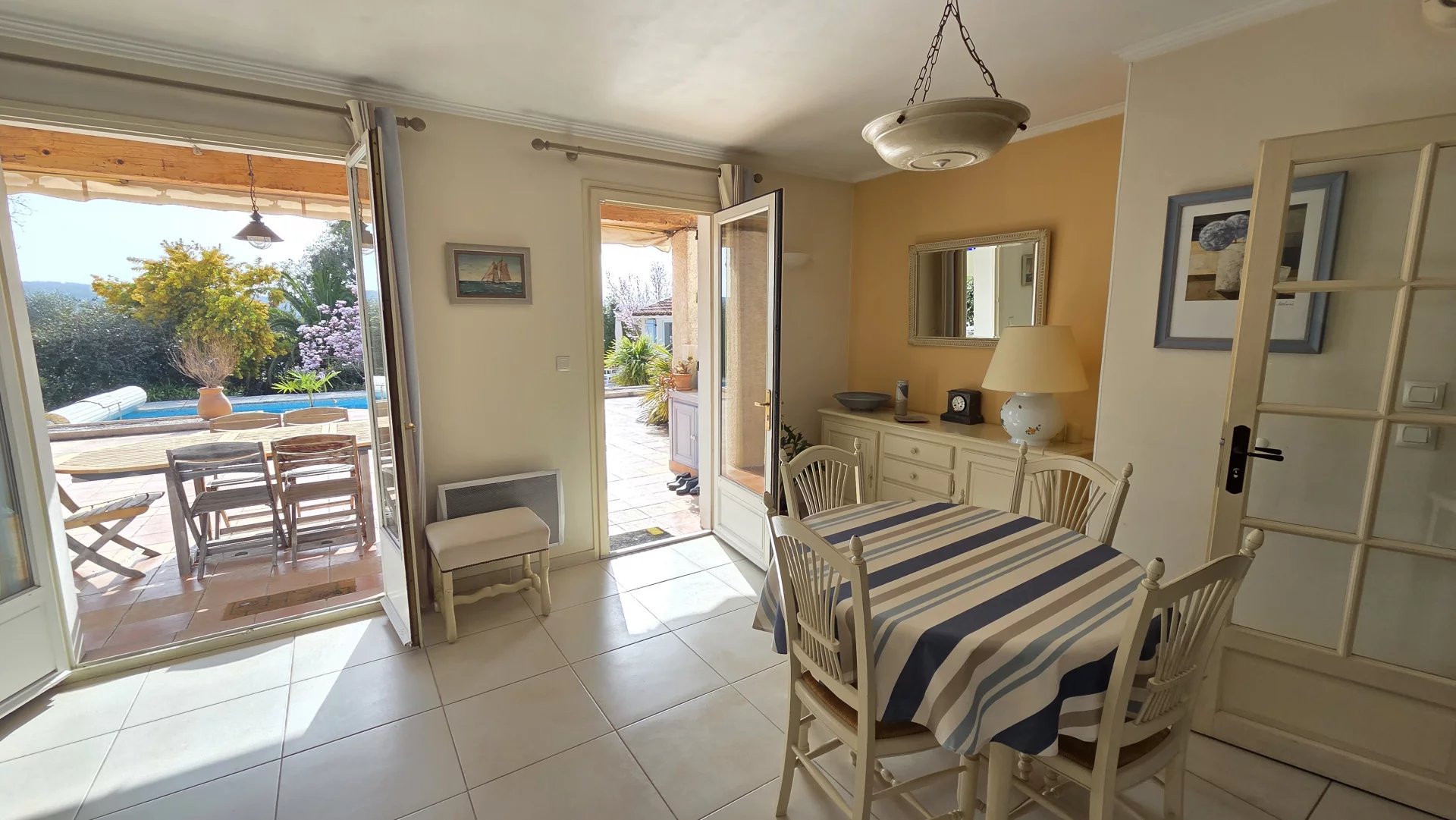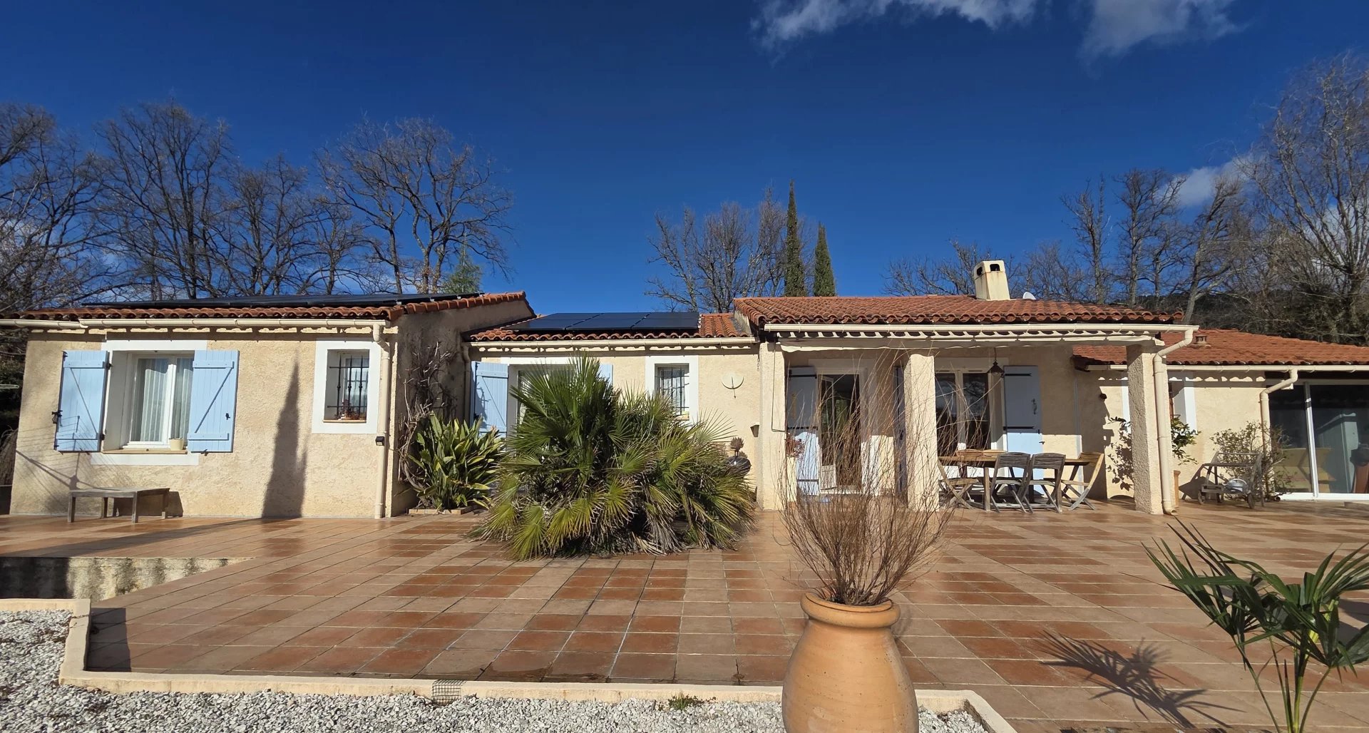 Située sur la commune de Tourrettes (Pays de Fayence), dans un environnement résidentiel, découvrez cette belle villa familiale d'environ 150m² parfaitement entretenue. Entièrement de plain-pied, elle est implantée sur un terrain plat et arboré de 2350 m². La maison se compose d'un vaste et lumineux séjour/salle à manger traversant, une cuisine indépendante toute équipée avec cellier, 4 chambres, 1 bureau, 2 salles de bains/douche. Terrasse plein sud de 200m² env sans vis à vis. Climatisation. Studio indépendant qui permet d'accueillir famille et amis.