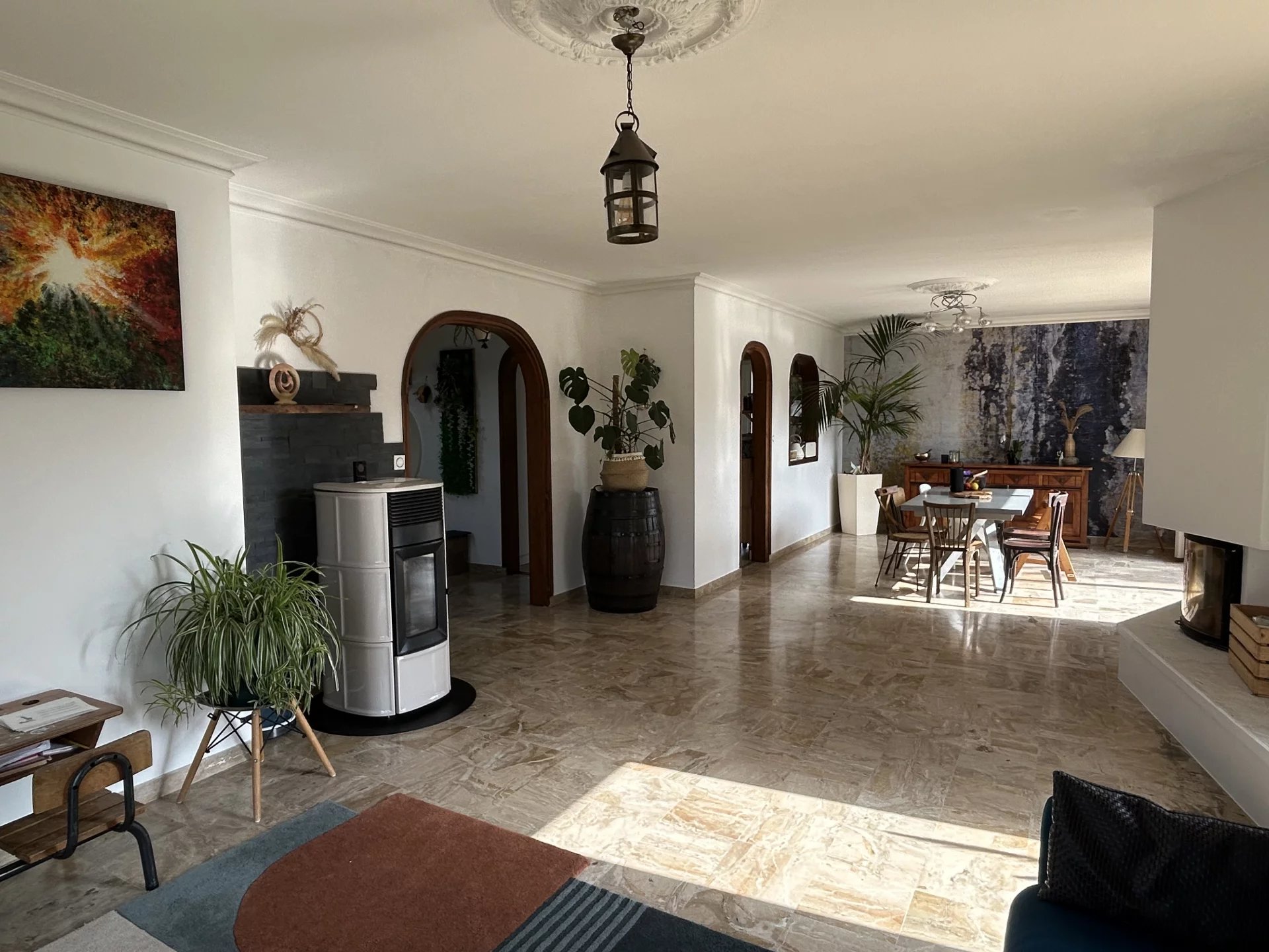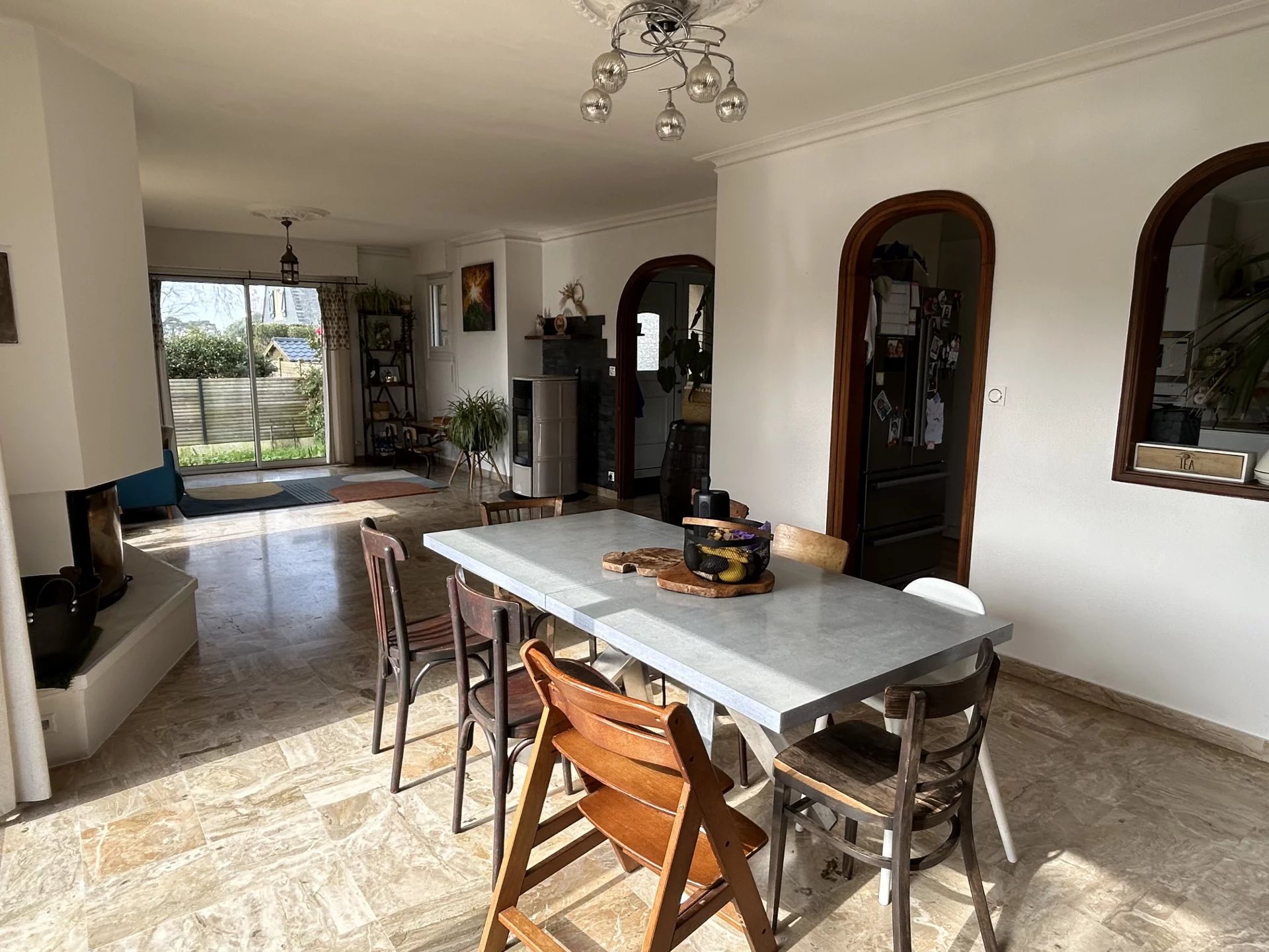 Au rez de chaussée, une magnifique entrée, un w-c séparé, une buanderie, une jolie cuisine aménagée et équipée, une lumineuse pièce de vie avec un très grand séjour, agrémenté d'un poêle à pellet et d'une cheminée donnant sur terrasses. Véritable vie de plain-pied avec une chambre et une salle de bains au même niveau.