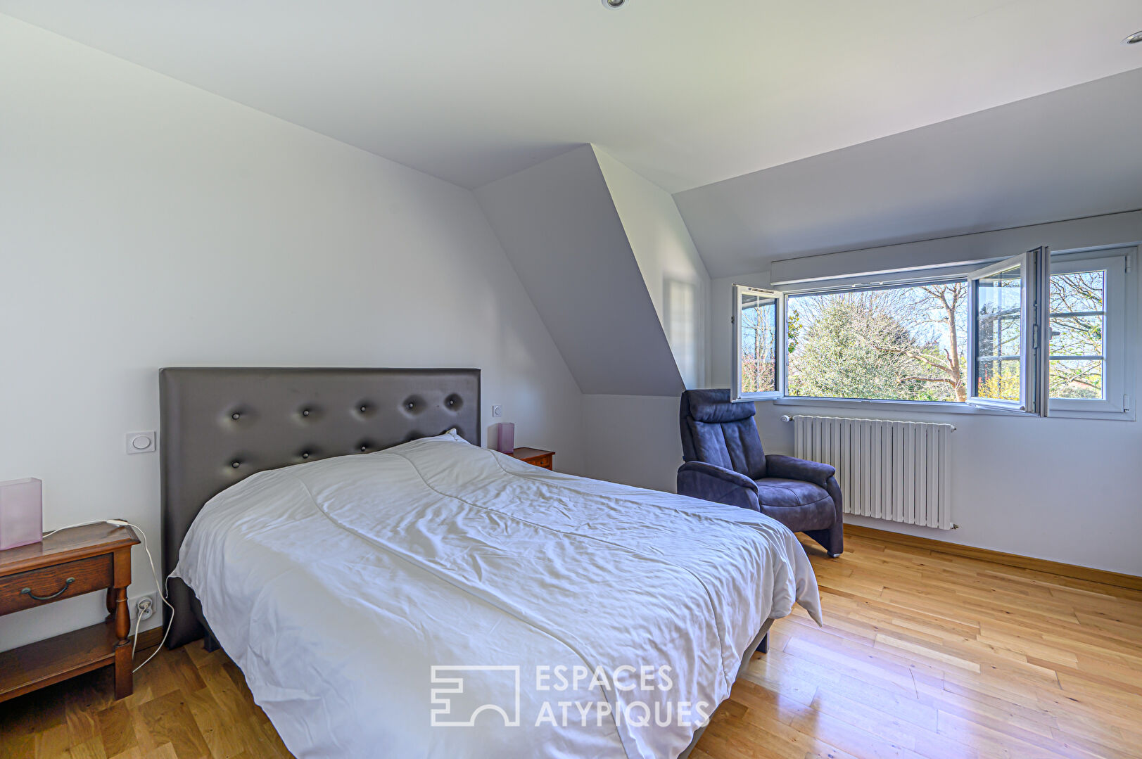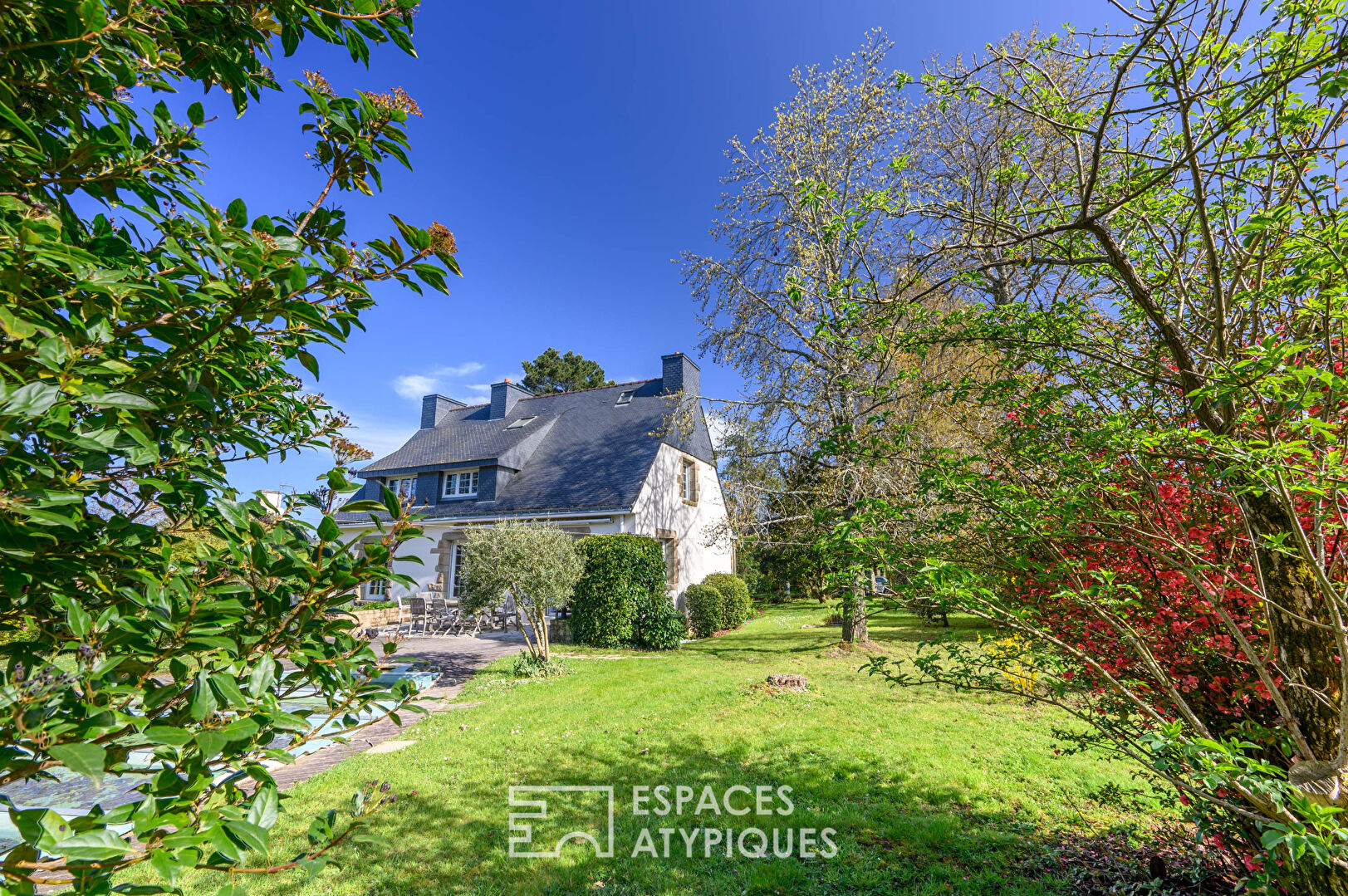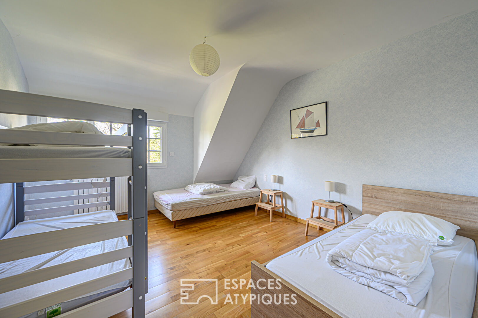 Au coeur de Baden, à proximité immédiate du golf et des sentiers côtiers, cette maison néo-bretonne de 150 m² s'inscrit dans un environnement privilégié. Édifiée sur un vaste terrain arboré de 4500 m², elle offre un cadre de vie harmonieux entre nature et confort. Une piscine extérieure complète cet ensemble, invitant à la détente en toute intimité. L'architecture néo-bretonne confère à cette demeure un charme authentique, sublimé par des volumes généreux et une distribution fonctionnelle. Le rez-de-chaussée s'articule autour d'une pièce de vie lumineuse, agrémentée d'une cheminée, idéale pour des moments conviviaux. Une cuisine aménagée et équipée, aux lignes intemporelles, facilite le quotidien. Cet espace de plain-pied comprend également une chambre et une salle d'eau, garantissant confort et praticité. A l'étage, plusieurs chambres spacieuses bénéficient d'une belle luminosité et d'un agencement optimisé, parfait pour accueillir famille et invités. Pour un rangement optimal, l'habitation est complétée par un sous-sol s'étendant sur la totalité de sa surface, ainsi qu'un grenier aménageable. A l'extérieur, le vaste jardin paysager déploie une végétation soignée, entre arbres matures et massifs fleuris, offrant un cadre paisible et verdoyant. La piscine, idéalement exposée, constitue un véritable atout pour profiter des belles journées ensoleillées. L'environnement immédiat, entre littoral préservé et infrastructures pratiques, assure un cadre de vie privilégié : commerces, écoles et services sont accessibles en quelques minutes. Cette propriété se distingue par son emplacement rare, son potentiel et son atmosphère préservée, à quelques encablures du Golfe du Morbihan. Une opportunité unique d'acquérir un bien de caractère, alliant cachet et cadre de vie recherché. CLASSE ÉNERGIE : E / CLASSE CLIMAT : E Montant moyen estimé des dépenses annuelles d'énergie pour un usage standard, établi à partir des prix moyens des énergies indexés sur les années 2021, 2022 et 2023 : entre 3330 euros et 4560 euros/an Les informations sur les risques auxquels ce bien est exposé sont disponibles sur le site Géorisques : www.georisques.gouv.fr AURELIE TATARD 07 62 98 22 96 RSAC Vannes 803 683 606 Aurélie TATARD (EI) Agent Commercial - Numéro RSAC : 803683606 - VANNES.