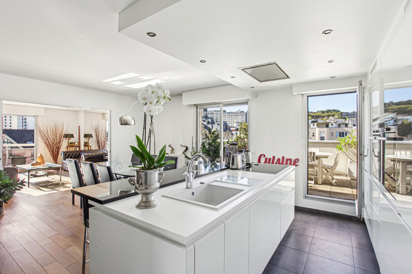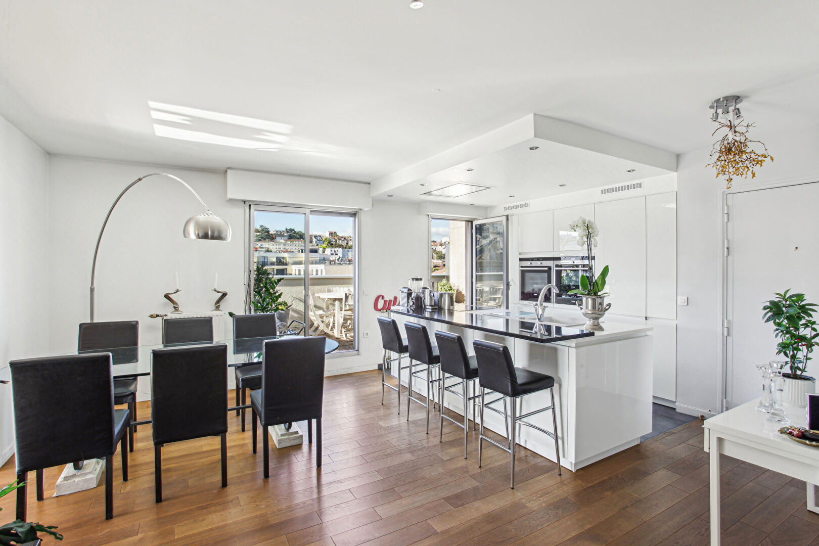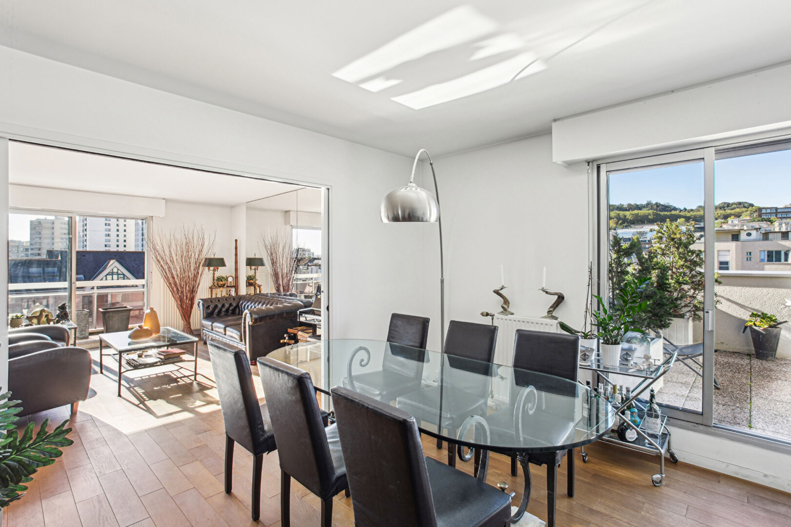 L'agence Villa d'Ouest Immobilier vous propose un magnifique appartement en coeur de ville, en face de la Mairie. Situé au dernier étage d'une résidence de très bon standing, un appartement familial de 5 pièces bénéficiant d'une vue dégagée comprenant : une grande pièce de vie avec cheminée, une salle à manger, une cuisine américaine aménagée et équipée, le tout ouvert sur une un grand balcon et une terrasse offrant une vue dégagée et sans aucun vis à vis, un WC séparé, 3 chambres dont 2 avec espace extérieur, une salle de bains et une salle d'eau avec WC. Ses ATOUTS : Appartement très lumineux, cheminée, parquet en chêne massif, triple exposition, belles prestations, Vue sur les beaux quartier de Suresnes avec aucun vis à vis. Une place de parking et une cave complètent ce bel ensemble. En coeur de ville à proximité directe des écoles, des transports et des commerces. A voir au plus vite ! (3.03 % honoraires TTC à la charge de l'acquéreur.) Copropriété de 114 lots. Charges annuelles : 5535 euros.