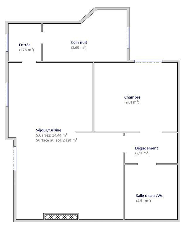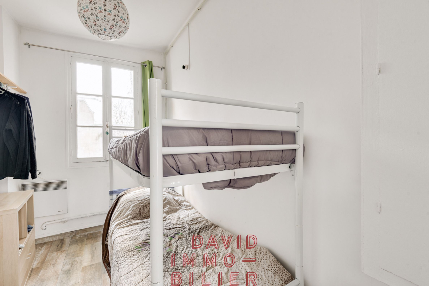 L'appartement comprend 2 chambres, dont une de 5,69 m², parfaite pour une chambre d'enfant, un bureau. Une salle d'eau avec WC complète l'ensemble.
