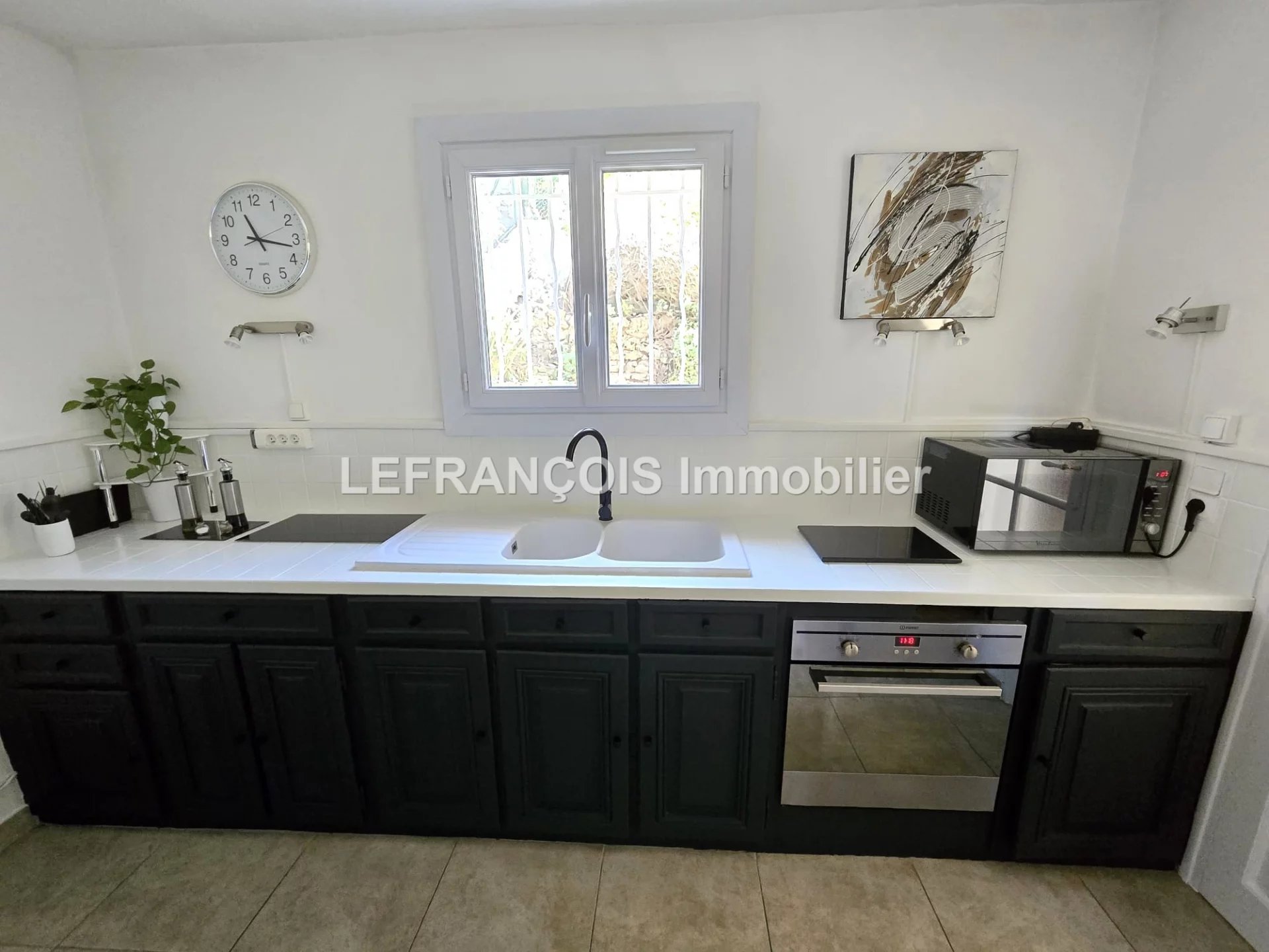 A l'extérieur : une terrasse avec cuisine d'été, un garage et un jardin dans le prolongement de la maison. La propriété est entièrement clôturée et fermée par un portail.