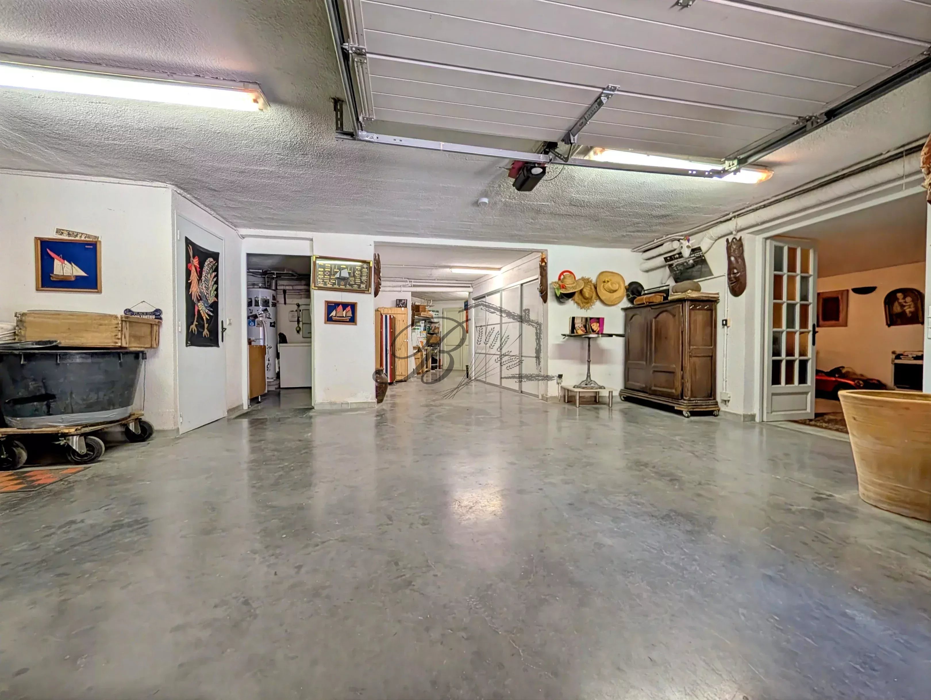 Le rez-de-chaussée de la bâtisse développe environ 180 m² et accueille deux garages, un atelier, une buanderie, une salle de jeux ainsi que de nombreux espaces de rangement.