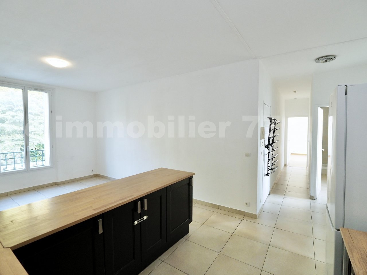 Entrée, spacieux séjour avec cuisine 'américaine' aménagée et semi-équipée (four neuf, réfrigérateur, plaque, hotte), 2 chambres, salle d'eau avec wc.