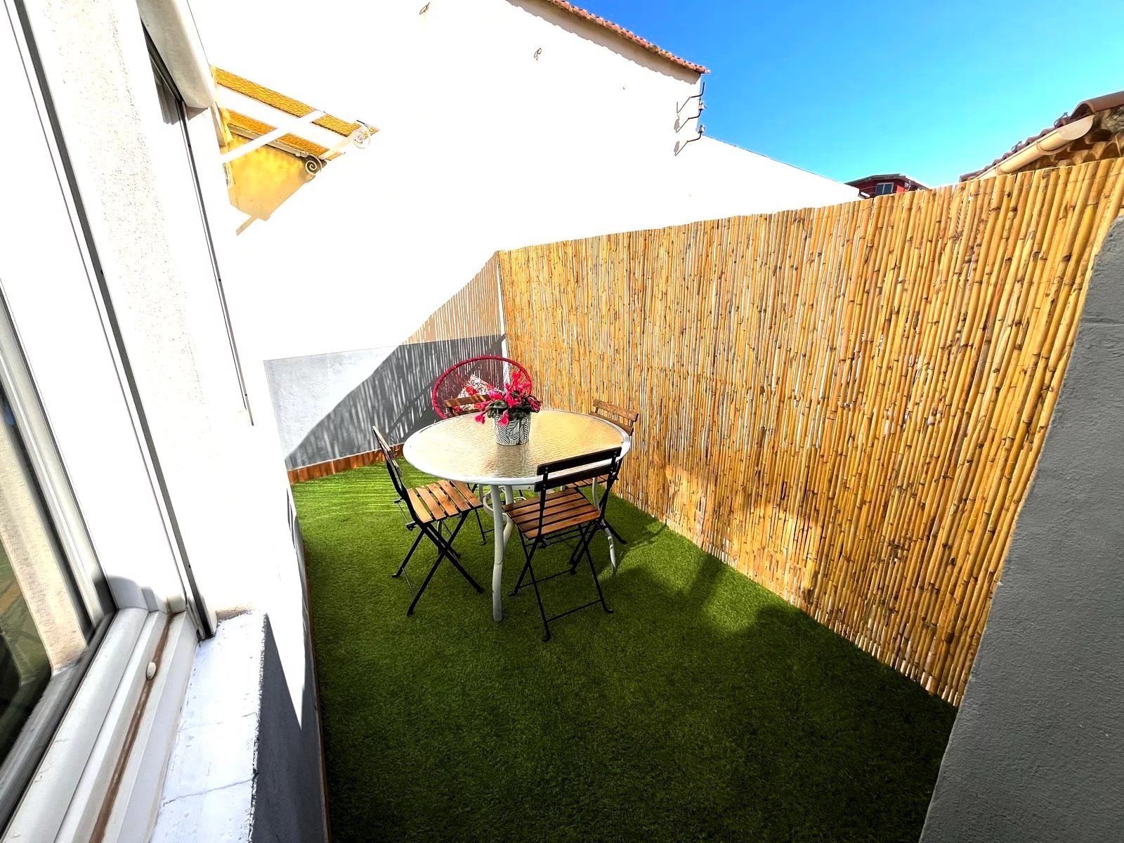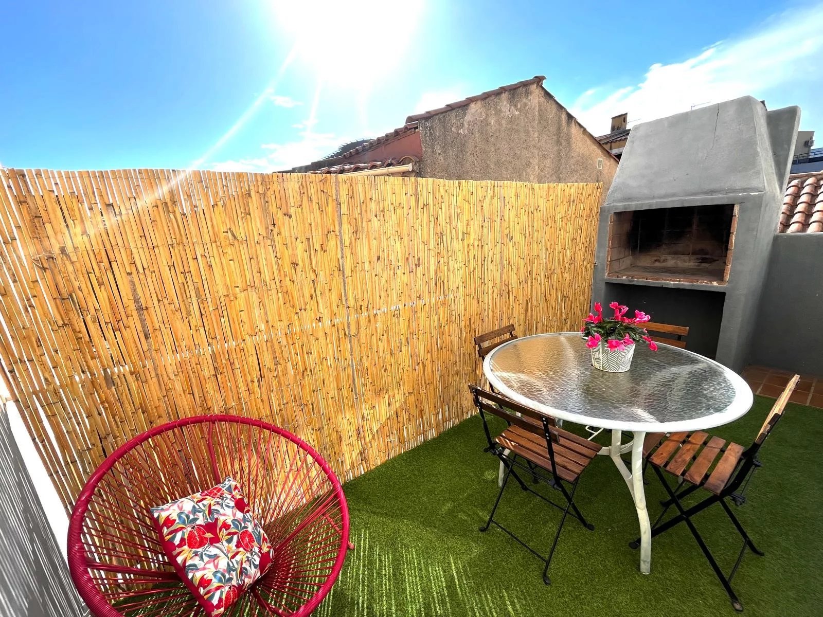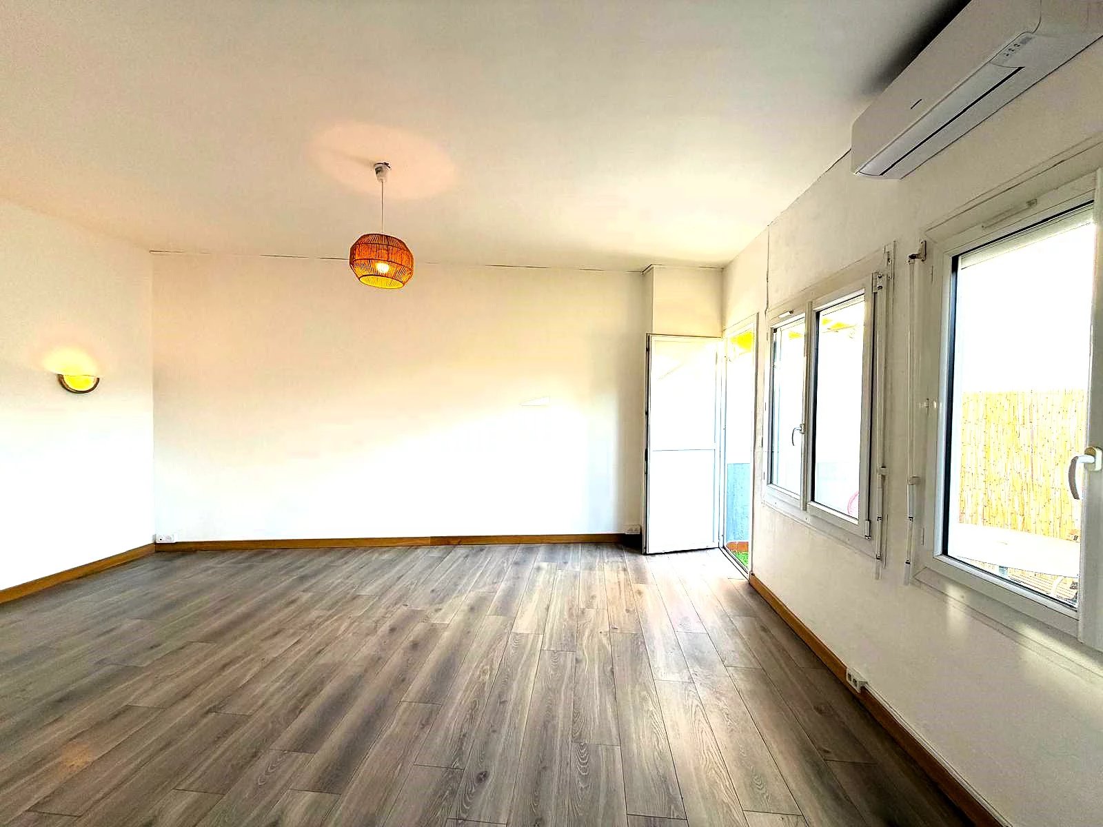 Il dispose d'une entrée, d'une spacieuse pièce de vie ouvrant sur une terrasse calme et ensoleillée avec barbecue, d'une cuisine semi-ouverte équipée récente, d'une agréable chambre de 13 m2 d'une 2ème chambre/ bureau de 9 m2, d'une grande salle d'eau avec toilettes et d'un cellier/garde-manger.