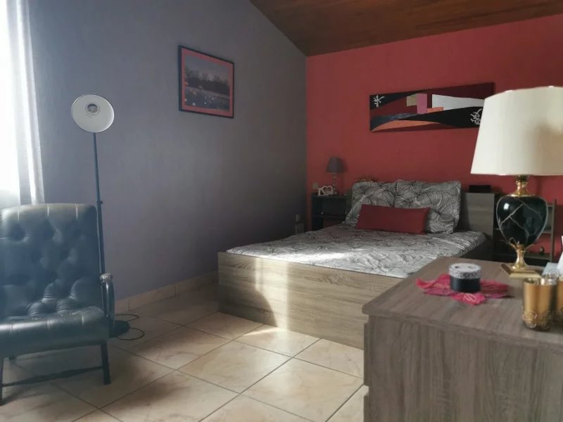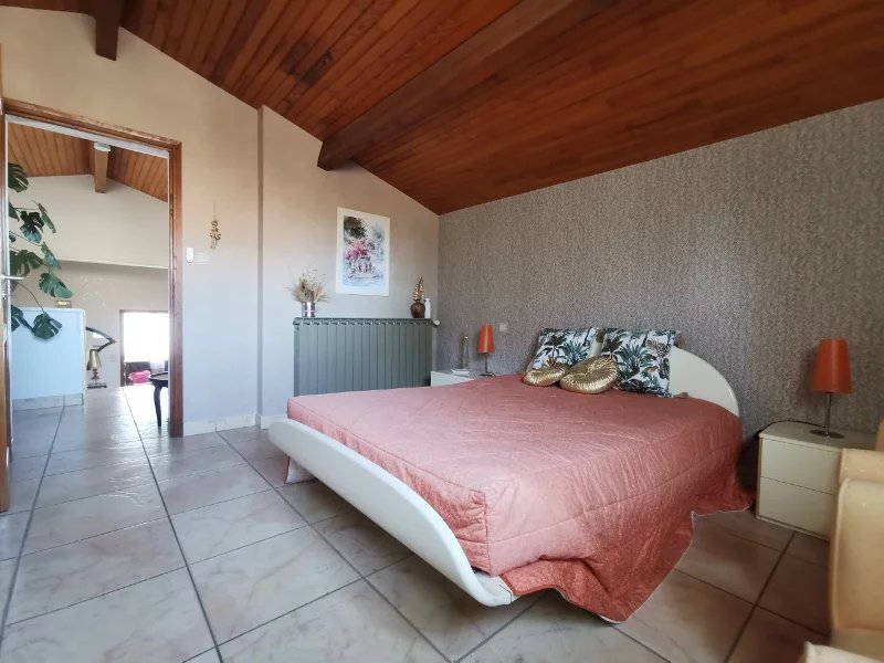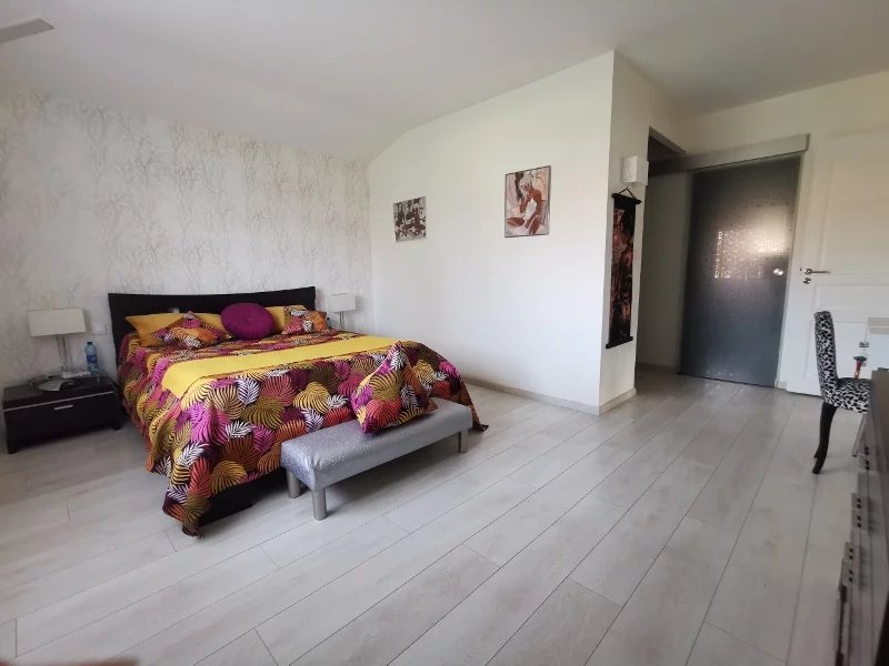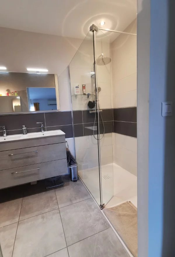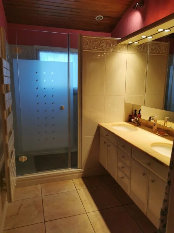 Au dessus: 2 belles chambres, une salle d'eau et un WC et à un demi niveau supérieure une grande chambre avec une salle d'eau.
