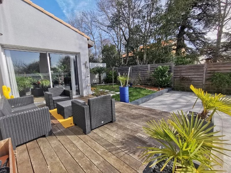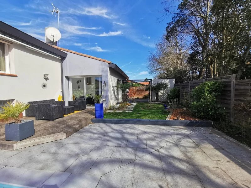 Côté jardin, 2 terrasses, une piscine équipée d'un volet roulant, sans vis à vis.