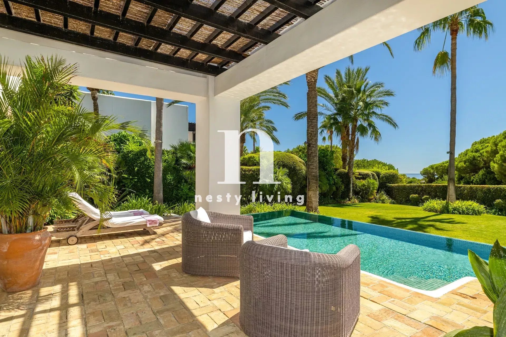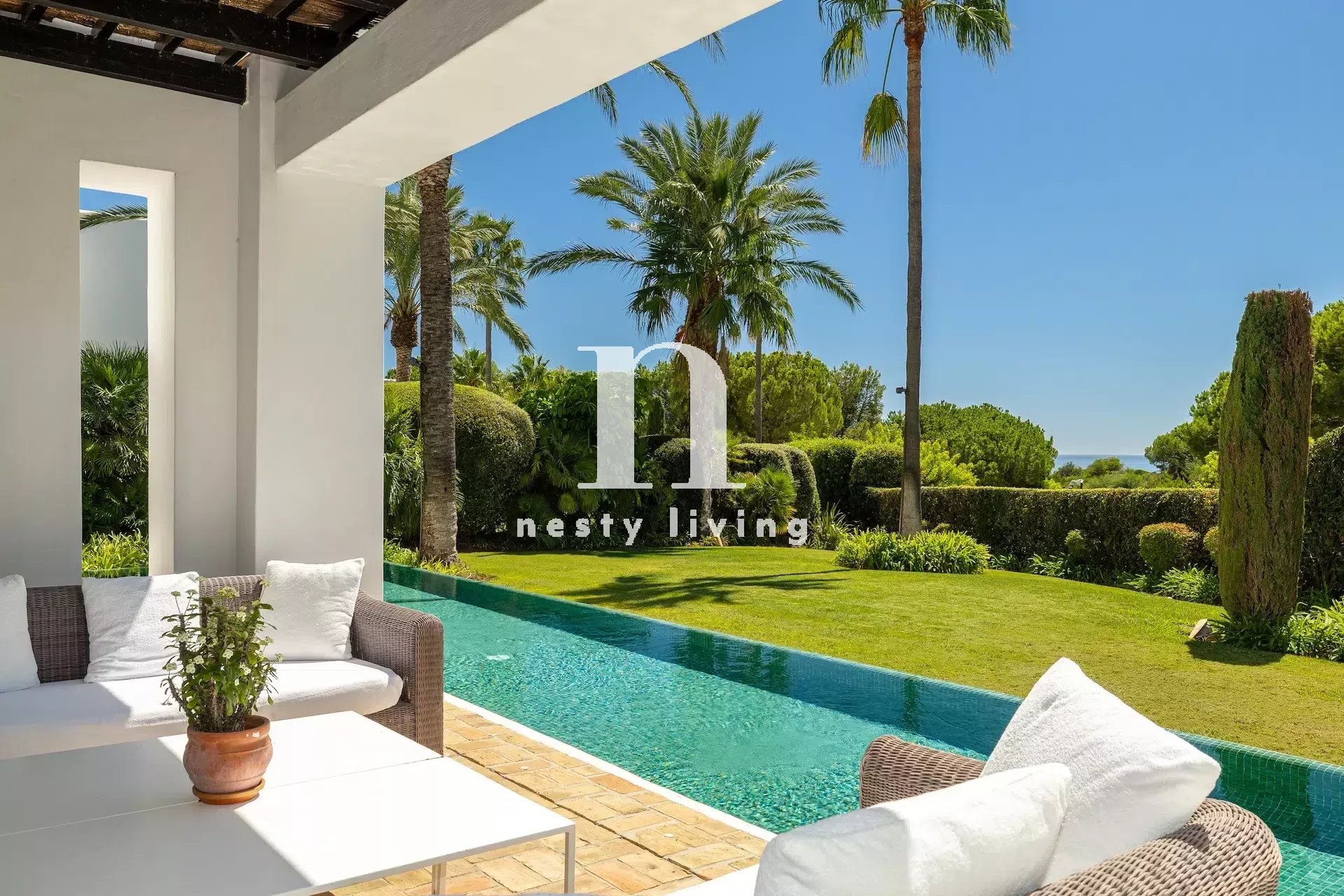 À l’extérieur, une piscine privée, entourée de verdure, ainsi qu’une vue sur la mer et d’un ensoleillement optimal.