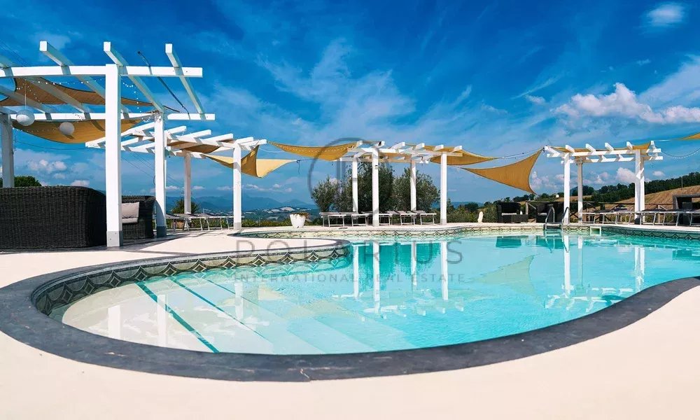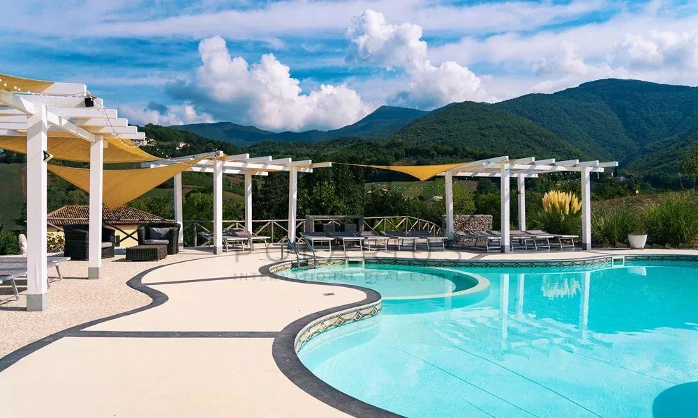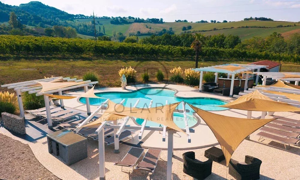Al centro dei giardini si trova una piscina unica di 13 m × 13 m con gradini romani, circondata da un ampio solarium con vista mozzafiato sul Monte San Vicino.