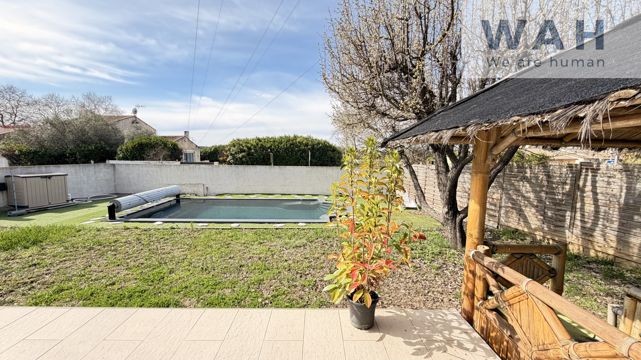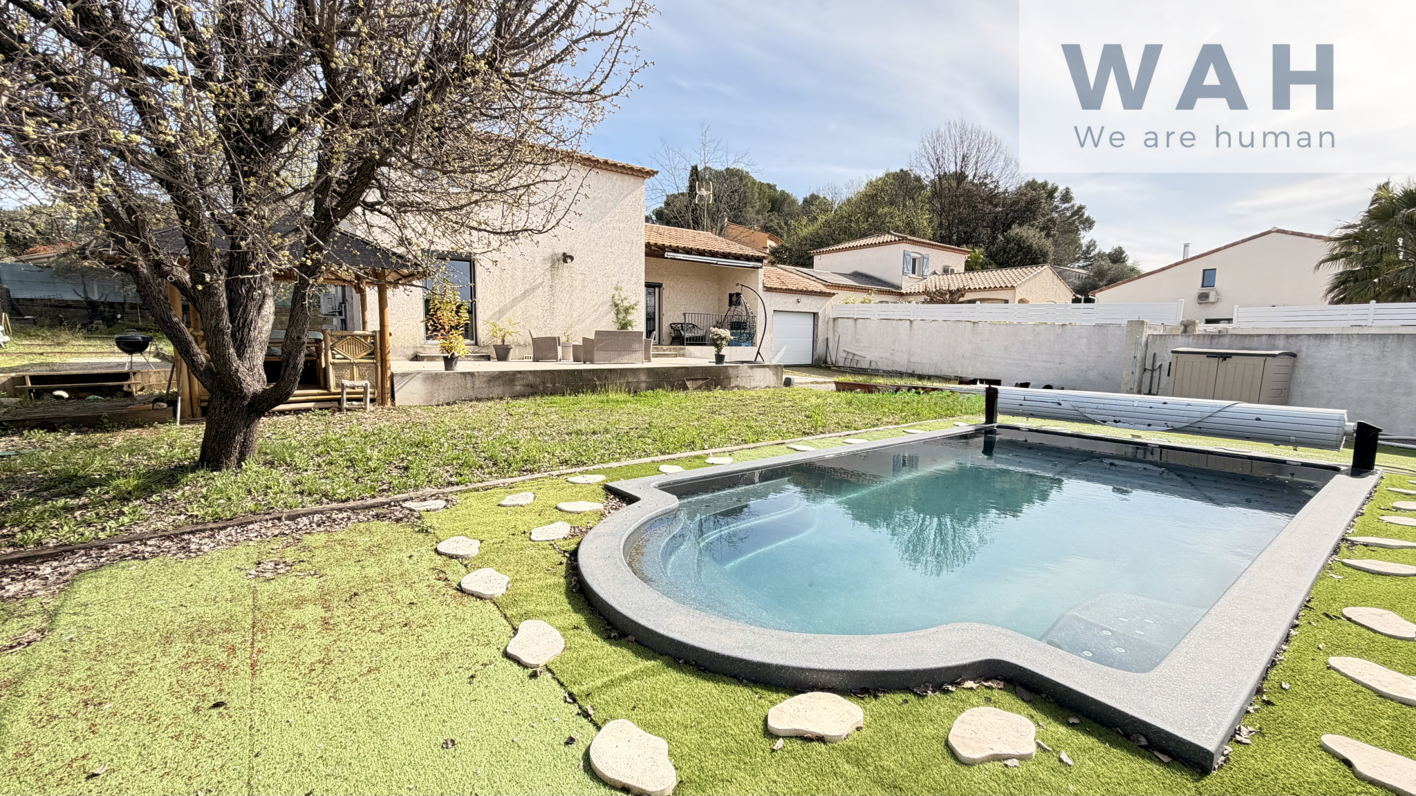 Evelyne Palamara, du réseau WAH, vous présente sur la commune de Saint-Aunès une maison de plain-pied de 130 M2, avec une mezzanine, sur un terrain de 830 m2 avec piscine.