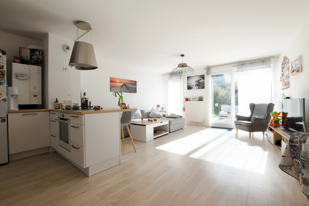 Au rez-de-chaussée, dès l'entrée, une penderie pratique vous permet de ranger facilement manteaux et effets personnels. Vous découvrirez ensuite un bel espace de vie lumineux d'environ 33 m2, comprenant : un salon / séjour convivial et une cuisine ouverte aménagée et entièrement équipée