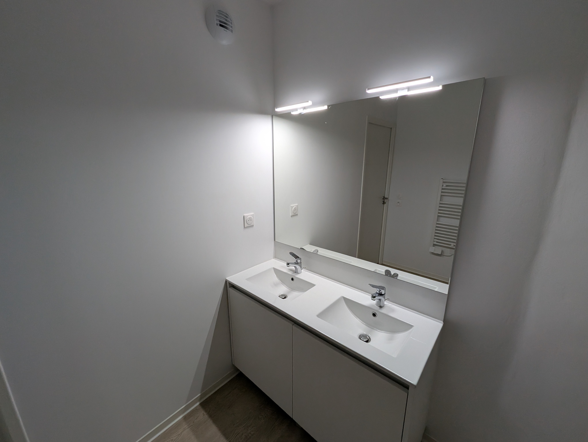 Le séjour : Une pièce de vie propre avec une cuisine ouverte (déjà équipée de plaques et hotte). C'est simple et fonctionnel.