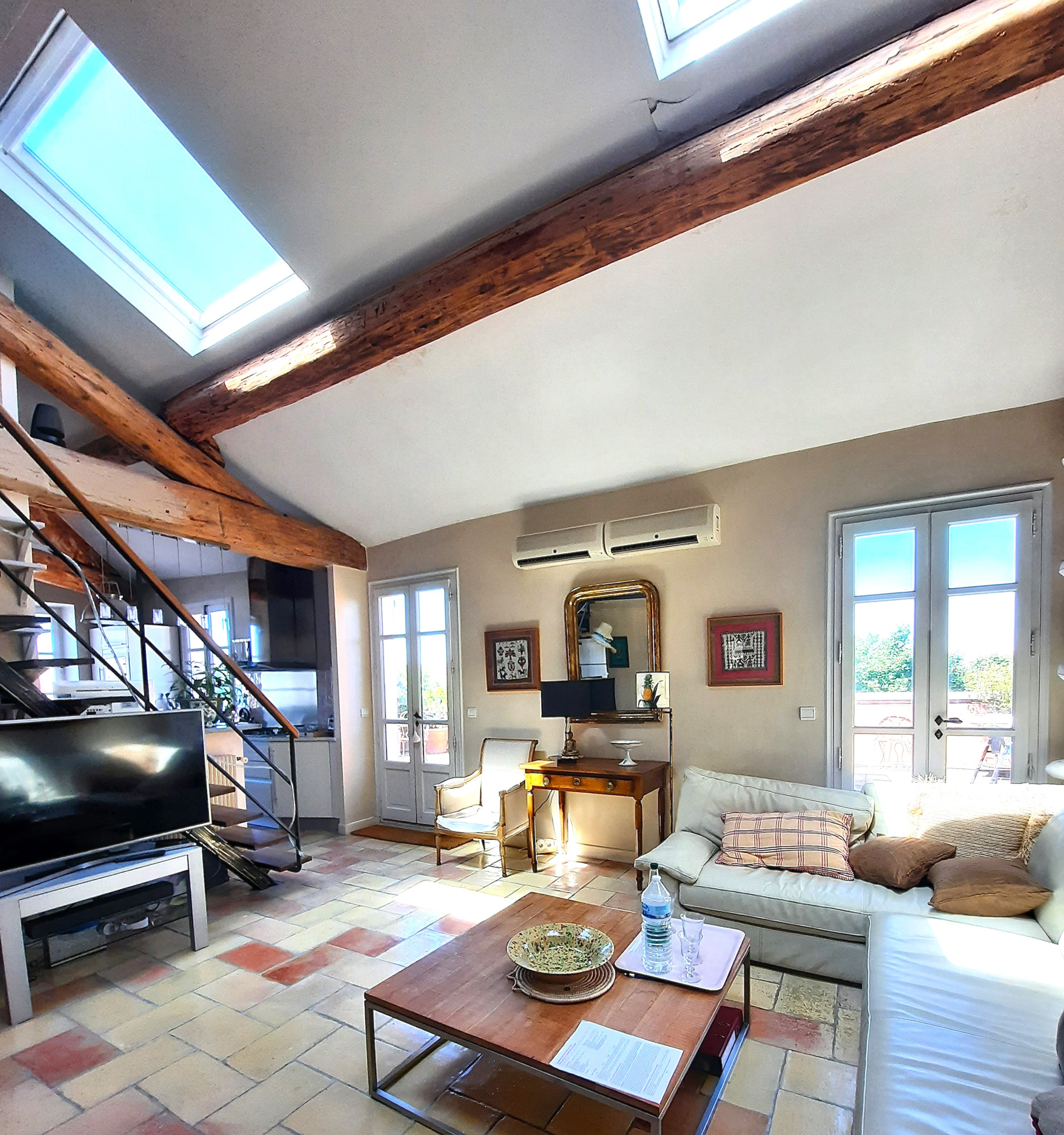 Actuellement aménagé en 2 chambres , séjour , salon et cuisine équipée ouvrant sur terrasse , coin bureau et bibliothèque en mezzanine , sa composition peut egalement permettre une 3ème chambre si nécessaire. L appartement offre de nombreux placards de rangements , 2 wc , une salle de bains . Présence de climatisation et de chauffage central.