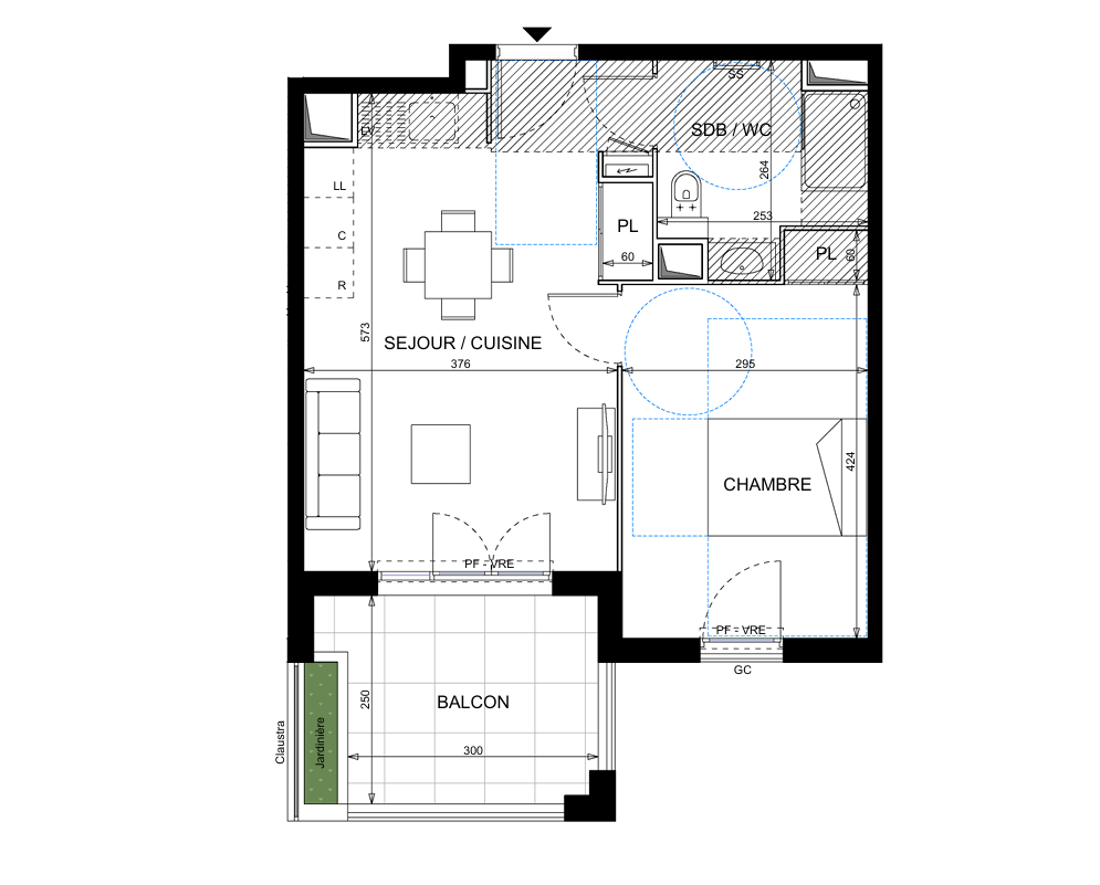 T2 de 41 m2 au 1er étage avec un balcon de 8 m2 exposé SUD, une pièce de vie de 22 m2 et une chambre de 13 m2.