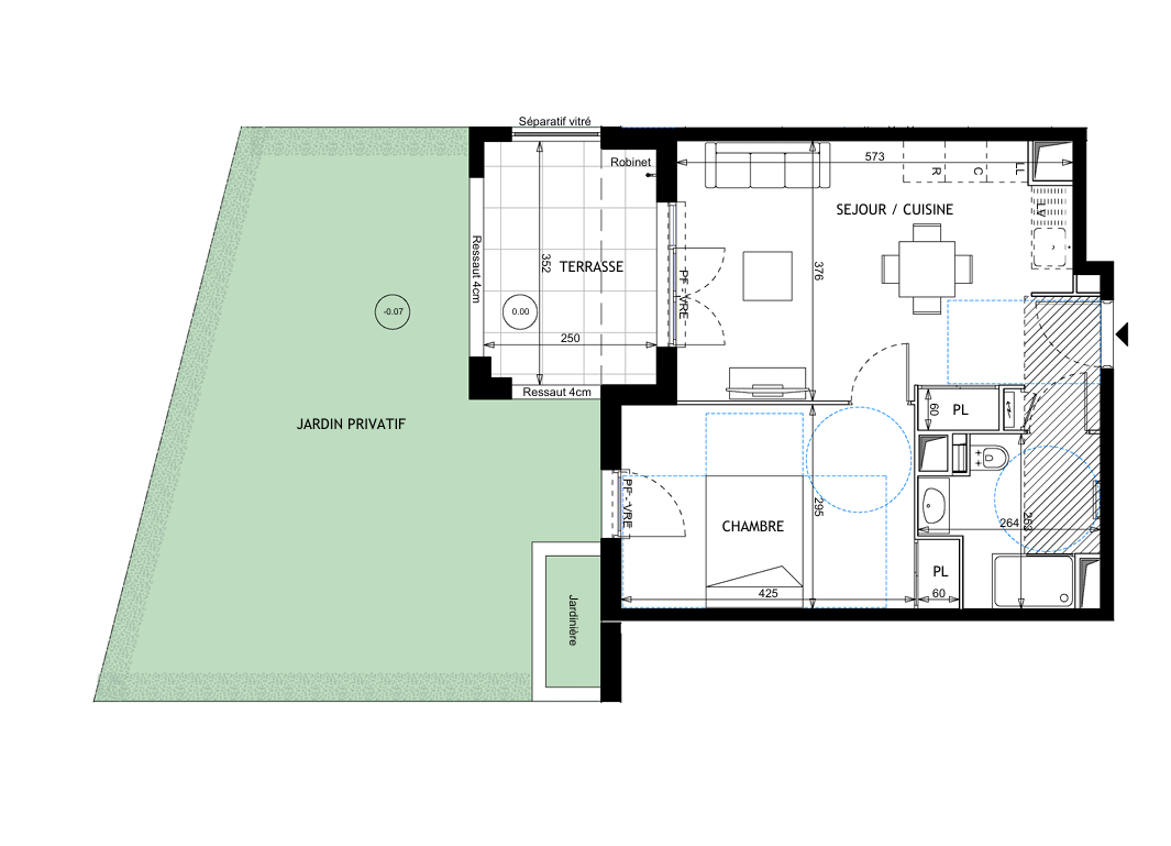 T2 de 41 m2 en rez-de-chaussée avec une terrasse de 9 m2 et un jardin privatifs de 38 m2 exposés SUD, une pièce de vie de 22 m2 et une chambre de 13 m2.