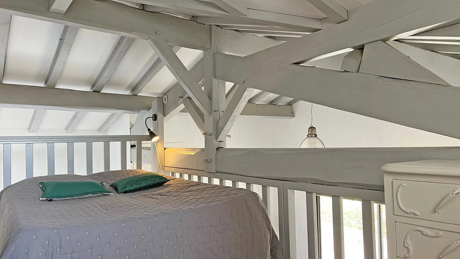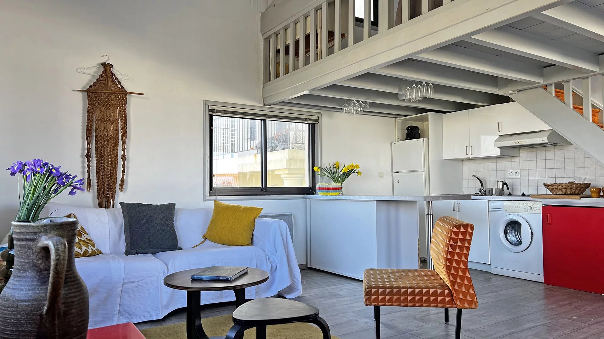 L’appartement propose une pièce de vie lumineuse avec cuisine ouverte, accompagnée d’une salle d’eau et de WC. Une mezzanine parfaitement exploitée permet d’installer deux lits doubles, tandis que le séjour peut accueillir des couchages supplémentaires, portant la capacité totale à six personnes.