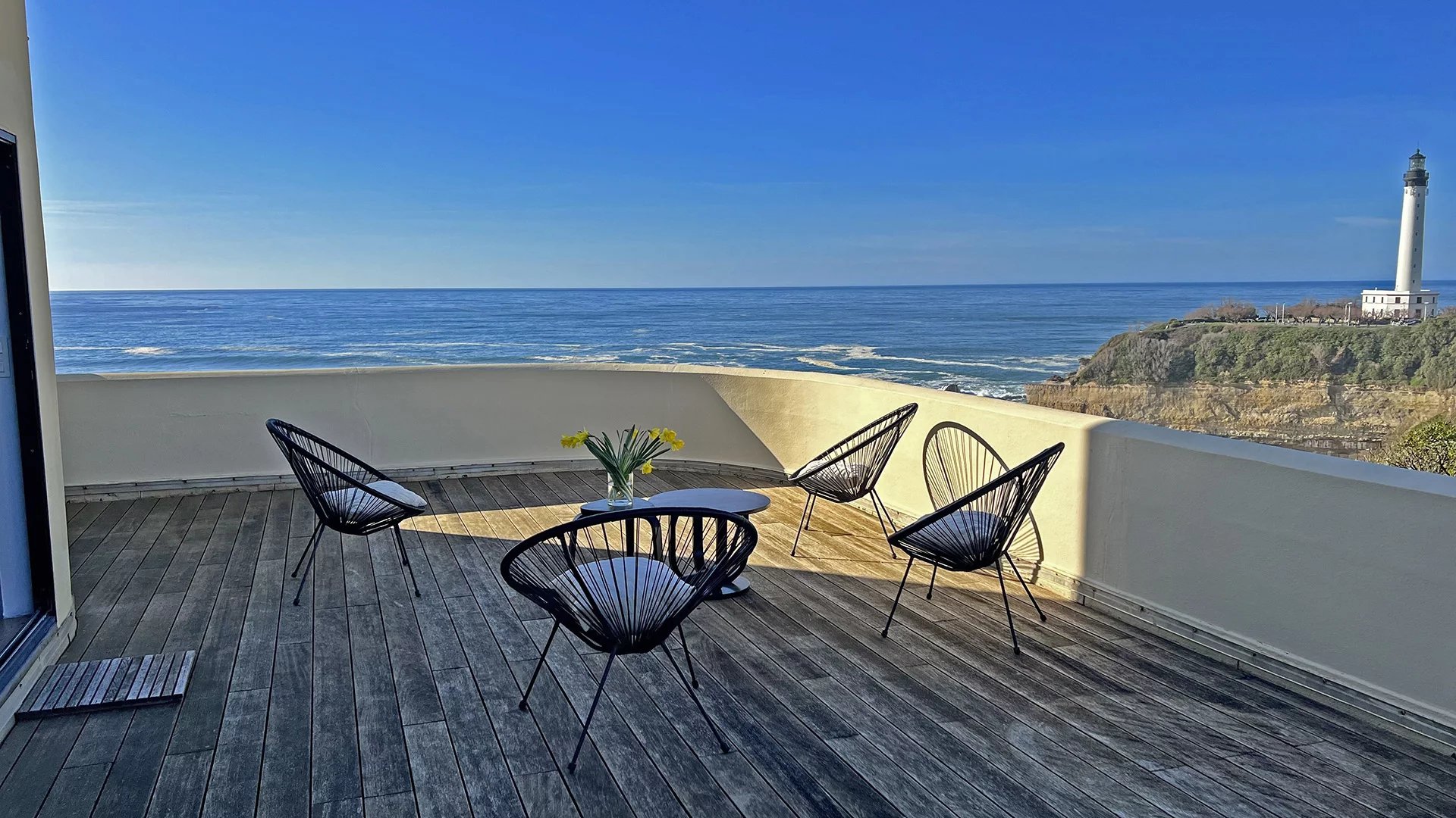 La véritable signature du lieu : une impressionnante terrasse de 41 m², ouverte sur l’océan, offrant un panorama unique sur le littoral et le phare de Biarritz. Un espace extérieur rare, idéal pour profiter pleinement du cadre exceptionnel.
