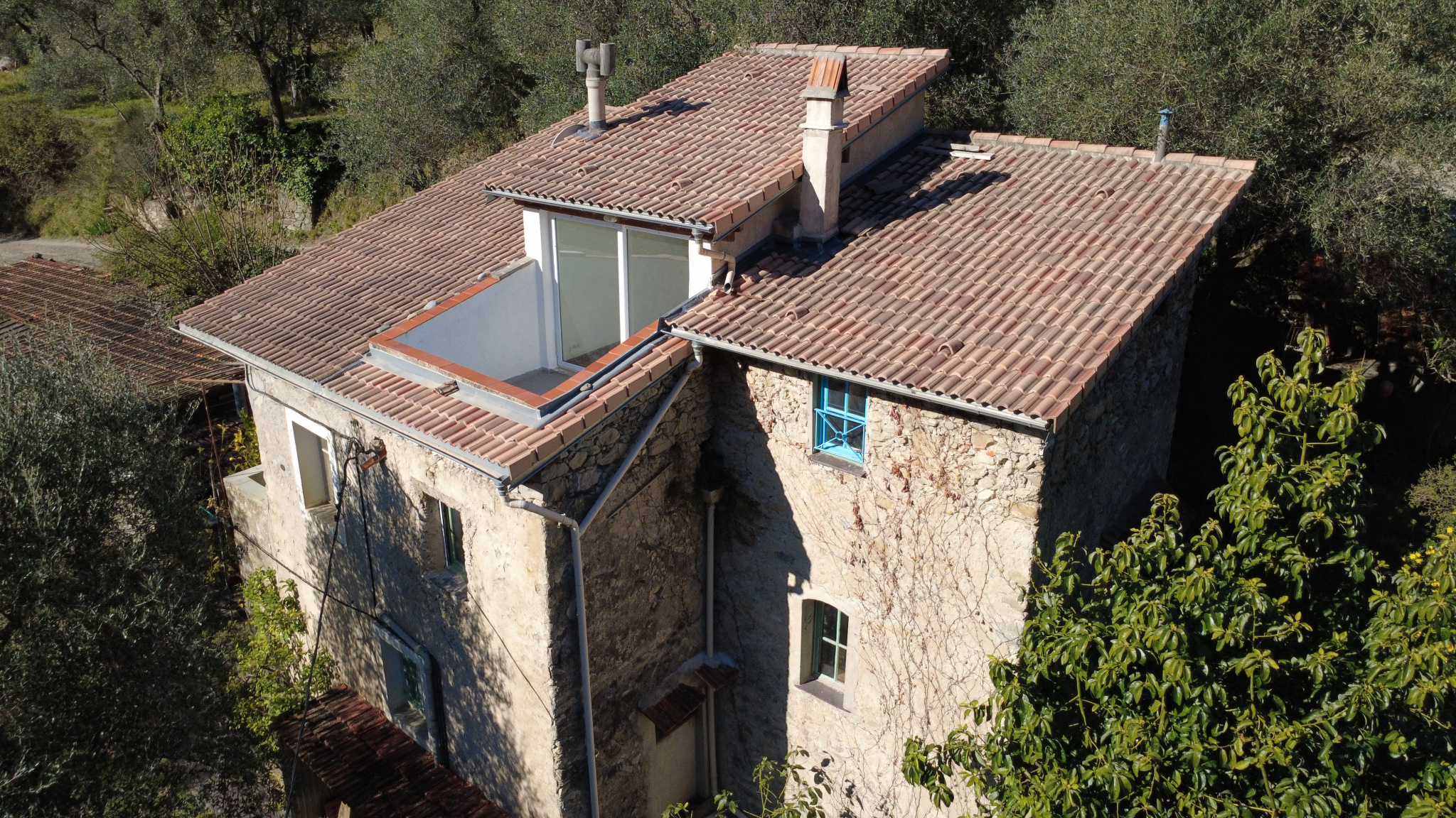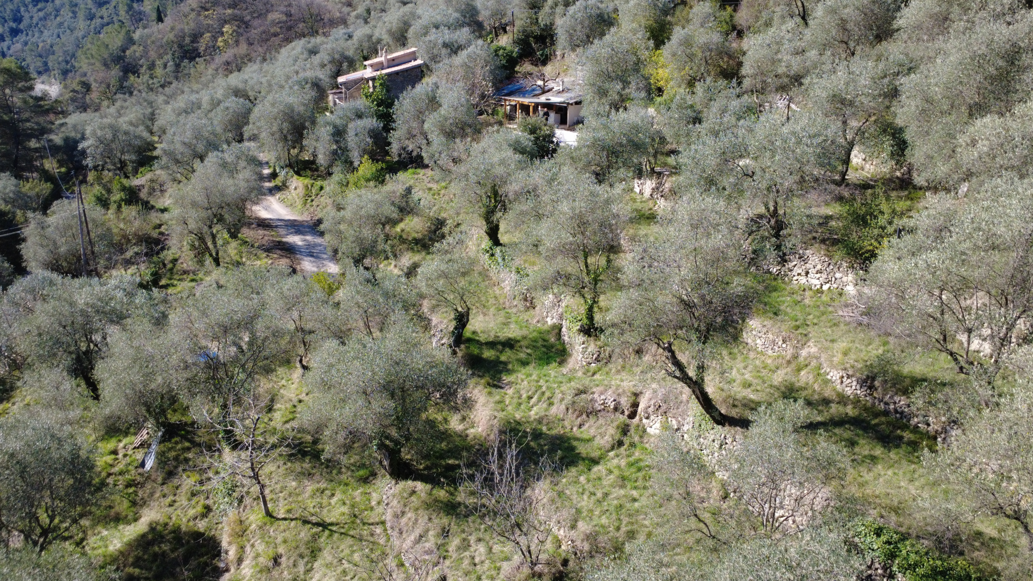 Maison mitoyenne avec grand terrain sans vis à vis. Le bâti principal comprend cuisine, salon avec terrasse, salle d'eau, deux chambres dont une avec accès direct depuis l'extérieur, cave. Sur le terrain immédiatement devant la maison, une piscine, une grande terrasse avec cuisine d'été et un bâti en pierre aménageable de 22 m2 au sol. Accès voiture facile depuis la route principale en aval de Breil sur Roya, courte piste à la fin, 3 places de parking déjà aménagées. Grand terrain en belles planches-restanques en oliveraie et verger de 12 700 m2. Très ensoleillé et propice à toutes les cultures (citronniers et autres agrumes possibles). Eau de source efficacement partagée par une association municipale. La partie habitation est assez petite (41 m2) on est en quasi maison mitoyenne car on n'a que la moitié de l'immeuble (découpé verticalement, on voit la différence de couleur des tuiles sur la photo avec le toit). La partie extérieure autour de la piscine est extraordinaire. Très beau potentiel. Idéal vacances ou projet agricole.