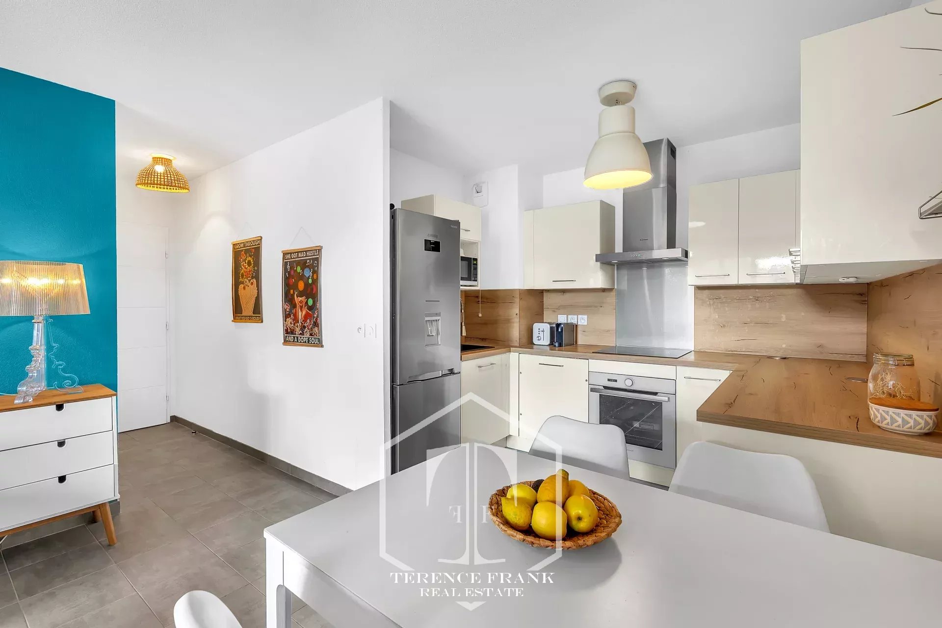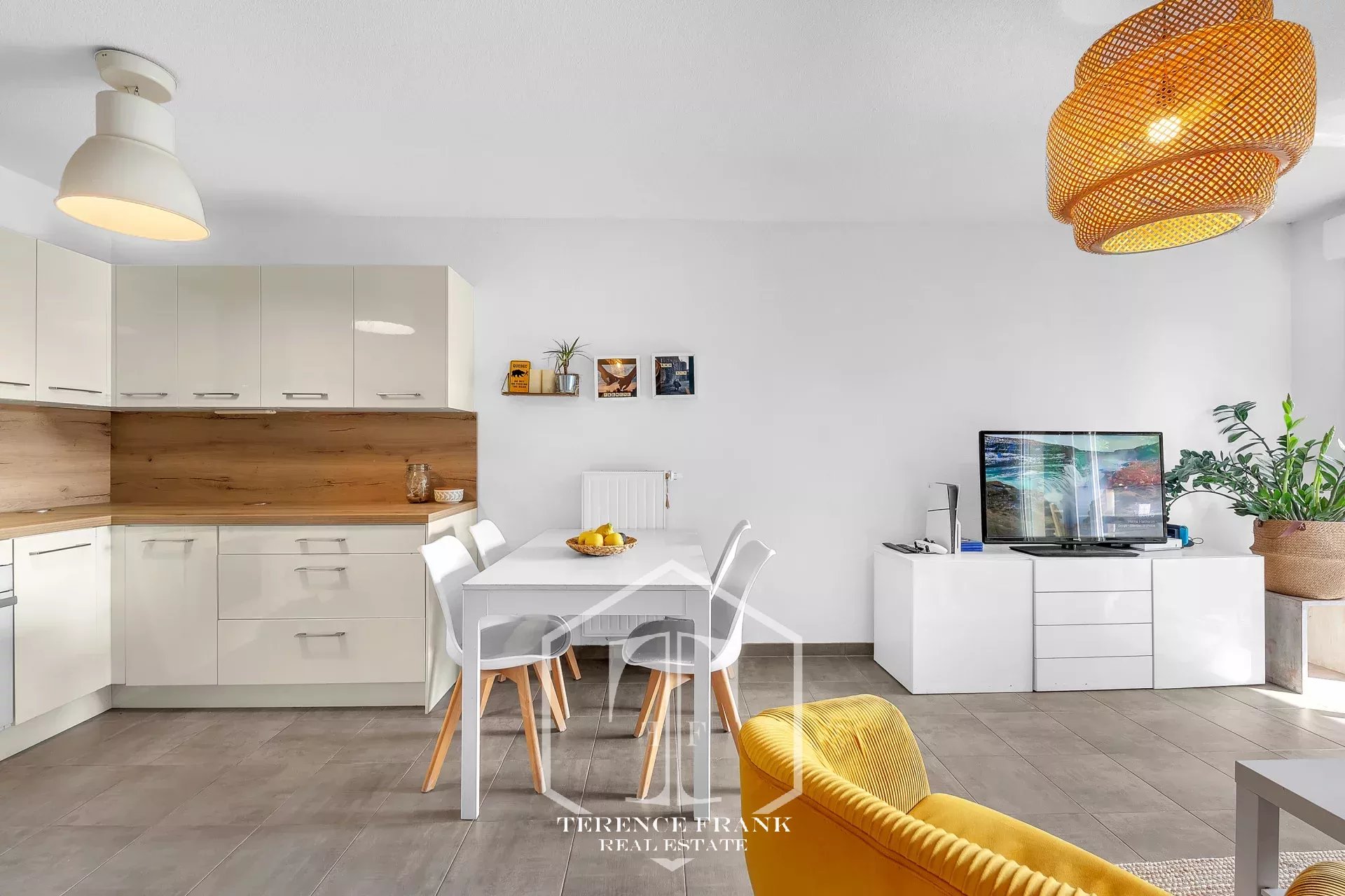 L’appartement offre un bel espace de vie lumineux avec un séjour de plus de 24 m² et sa cuisine américaine entièrement aménagée et équipée, dans un esprit.