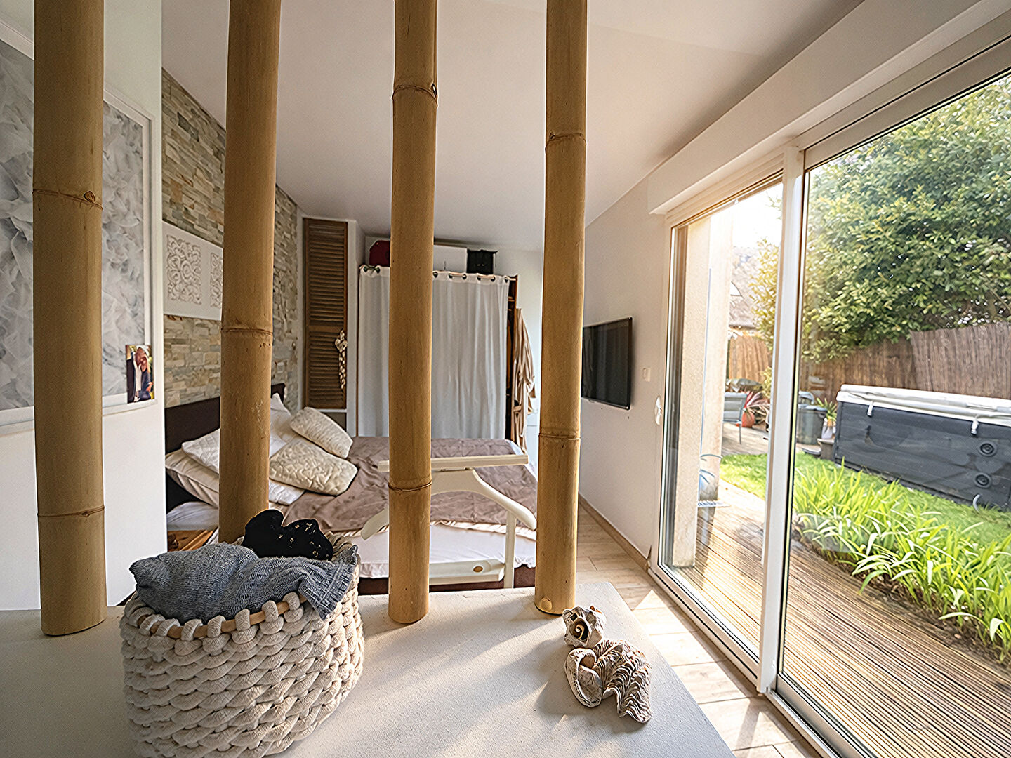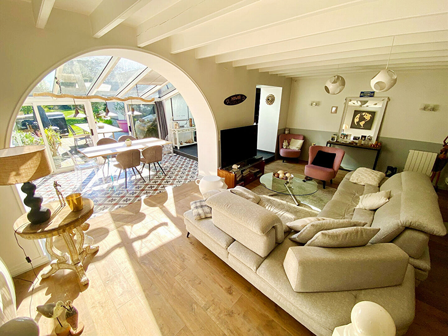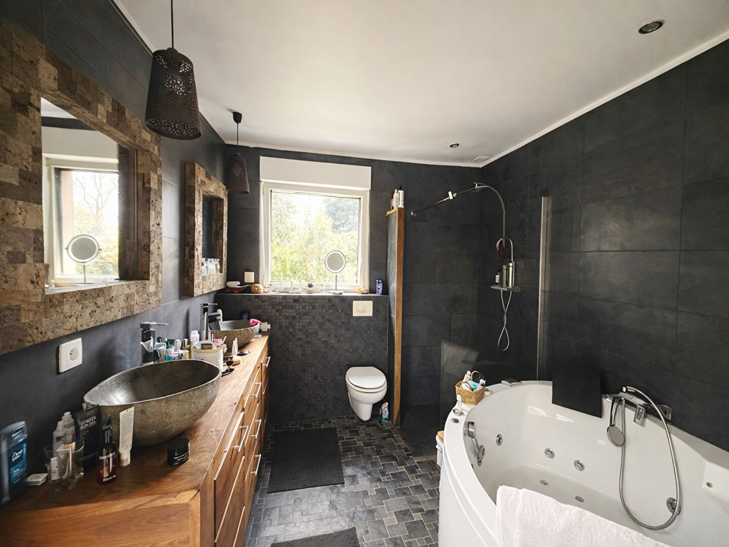 A VENDRE, SAINT-BRIEUC, quartier SAINTE THERESE, maison en pierre de 1927 sur 682m2 de terrain clos avec jacuzzi comprenant en rez de chaussée: entrée, wc lave mains, chambre avec salle d'eau privative, salon/séjour (59m2) avec poêle ouvrant sur terrasse et jardin au S/O, cuisine us équipée, bureau, suite parentale avec salle de bains, wc et placards, buanderie; au 1er : palier avec placard, 1 chambre (possibilité 2), salle de bains avec wc et placard, chauffage électrique par le sol , abri jardin, parking extérieur. TRÉS BON ÉTAT, CALME et ENSOLEILLÉE. (3.88 % honoraires TTC à la charge de l'acquéreur.)